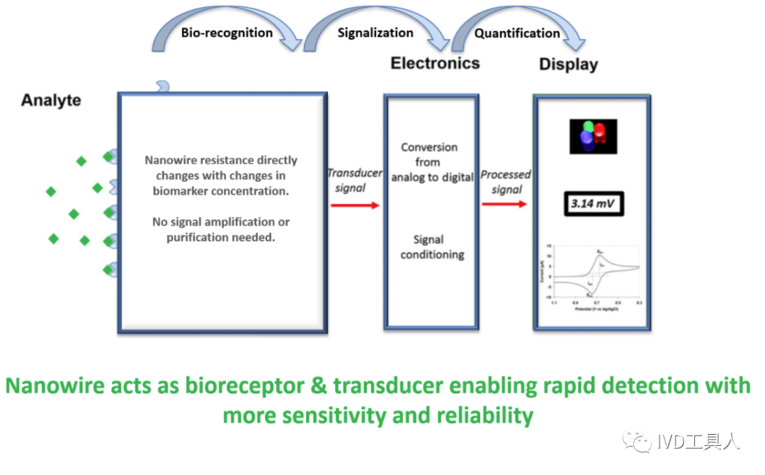 新闻如下: 马萨诸塞州波士顿 – NanoDx, Inc. 一家开发即时诊断解决方案的私营医疗设备公司,宣布与 IBM Research 就其金属氧化物半导体 (“CMOS”) 兼容纳米级传感器的使用许可达成协议,它可增强针对多种适应症的准确、快速测试,并且易于放大生产,包括 COVID-19、创伤性脑损伤 (TBI)、败血症和中风。NanoDx 正在寻求美国 FDA 的紧急使用授权,以进行快速、两分钟的 COVID-19 即时检测。 NanoDx 正在商业化这个POCT平台,它能够在不到两分钟的时间内检测和定量小液体样本中的生物标志物(分析物)。该公司围绕其纳米传感器设计和制造工艺建立了广泛的知识产权组合,涵盖整个体外诊断领域。 IBM Research 混合云副总裁 Mukesh Khare 表示:“与 NanoDx 的合作是 IBM 对‘硬技术’采取合作的一个例子:解决日常生活中的深层技术问题。” “值得注意的是,这种 CMOS 兼容设备可以在现有的OEM工厂中制造,易于扩大到具有规模效益的硬件。这种技术与 NanoDx 先进的纳米传感器平台结合,可以加快将快速诊断方案推向市场。” 检测原理 其他的生物传感器 Nanowire纳米线生物传感器 纳米线传感器将生物反应和信号传递整合为一体,所以更快,更灵敏,更可靠!巴拉巴拉广告词 ,我觉得差不多的!视频解说 根据官方视频,抗体包被在纳米线上,当抗体捕获病毒蛋白时,电阻抗信号会发生变化。 小编不是搞电化学的,不懂普通丝网印刷电极的电阻抗,与纳米线传感器 电阻抗的区别。可能就是普通印刷电极和需要微纳加工的芯片之间区别? 欢迎懂的大神来科普! 关于 NanoDx, Inc. NanoDx, Inc. 是一家私营医疗器械公司,开发突破性的床旁诊断解决方案,解决未满足的市场需求,改善患者治疗效果,同时降低医疗保健成本。该公司的旗舰产品 NanoDx ™系统能够在不到 2 分钟的时间内检测和定量来自小型流体样本的生物标志物(分析物)。 NanoDx 的平台利用专有的纳米传感器技术,具有广泛的潜在诊断应用,包括 COVID-19、创伤性脑损伤 (TBI)、流感、败血症和中风。 www.NanoDiagnostics.com |