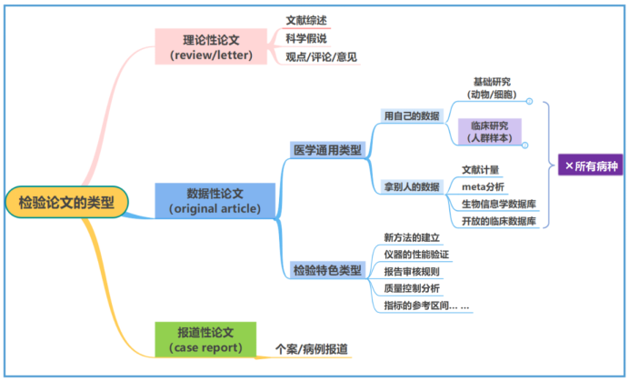 作者 | 张桐硕 多维度评价白衣天使的呼声不断,唯论文是举的时代正在远去,但身边的经验一再证明,坚持论文产出,依然是滋养我们成长的源头活水,平时养生(交流学术思想,推动学科进步),急时解渴(晋升职称或授予学位)。 发表论文的方式可谓千人千面。 有人大水漫灌,有人高山悬瀑,有人细水长流…… 有人只能遥望一江白月,茫然无措,干渴难耐。 如何写论文?这个烂俗的话题,越来越旱涝分化。 如果把医学圈比作一个生态系统,头部科研人才有实力雄厚的平台培育,又有源源不断的课题基金来浇灌,最终长成参天大树,然后开枝散叶,栽培新苗。 如果有幸加入这些大佬的团队,基本不用操心选题,通常会承接一个固定的研究方向,或分担某个环节。虽然辛苦,好在路径成熟,分配到的成果可期。 芸芸检验人,栖于树上的只是少数。 ◆很多人身在基层医院,科研资源相当贫瘠——没有带路人、没有高精尖的仪器、没有经费的支撑。 ◆处境堪比草根的,也包括不少三甲医院的检验小白,学历不低,但工作条件没法延续导师的课题,失去了大树的荫庇,独自面对论文选题。 ◆一些大龄在职研究生,应对完琐碎的工作,几乎没有精力再跑去养细胞、喂老鼠、跟踪RCT,陷入寻觅论文方向的焦虑中。 形形色色的草根检验人,胸中那份对科研初始的激情被一点点消磨,压力却与日俱增。参评职称、考核评优、研究生毕业……不说SCI,起码要有一篇“核心”来兜底。 这个痛点催生了一大波论文速成课程,如果你幻想着靠突击几天搞出一篇“灌水”论文,多半会呛一口水。 干渴到极致时,有人索性花钱“外包”,饮下掺沙造假的浑水。 笔者硕士毕业不久,手有余温,常有同事和同学兴冲冲地问我“如何写论文”,期待我提供几篇范文,用以照猫画虎。 从本科开始,我撰写过各类论文二十多篇。出于一枚“杂家”的习惯,自己常对接触到的研究内容和论文分门别类地进行梳理。 本着“先问是什么,再问怎么做”的基本逻辑,我引导咨询者把问题缩窄一点: “先说说自己中意哪类选题,确定好论文的形式,咱们再做计议。” 学术论文不比命题作文,医务人员做科研是一种个性化选择的过程,因地制宜,因人而异,不会有那种“排排坐听听课”的统一课堂。 很庆幸,检验论文的水系发达,提供给草根检验人广阔的选择空间。 检验在医学领域中属于“万金油”般的存在。这个学科依托于纷繁的生物标志物而生,而生物标志物可以切入任何临床问题,不像其他临床专科那样局限于某类器官或病种。无论心肝脾肺肾,只要发现有标志物异常,涉及检验的科研就如影而至。 不仅如此,检验又是一门典型的医学、理学与工程学的交叉学科,涵盖了实验室质量管理、方法学评价等检验特有的研究方向。 谁说草根检验人注定匍匐在科研荒漠中?仔细勘察,或许地表下就有一脉弱水合你口味——门槛低、上手快、花钱少。 话不多说,奉上我独家制作的思维导图。 「理论性论文」看似纯属动嘴皮子的功夫,省去了数据处理的苦恼,但对学术视野和文笔的要求更高,医学期刊留给这类论文的版面比例却很少。最打击人的是,许多单位评职称和毕业时不承认它。研究生写综述是科研训练的必要环节,专家一般是受邀发表高论,草根检验人只能靠热情发电了。 站在功利角度,这类论文的性价比不高,倘若兴之所至,也不妨把肚里的见解一吐为快。我曾讨论过人工智能给检验医学带来的变革,知网下载超过1300次,成就感满满。 「报道类论文」类似书写大病历,一线医生容易上手。可惜,它与「理论性论文」同病相怜——河道太窄,主流杂志每期只刊登两三篇。大家工作中不免遇到疑难病例和奇怪的检验数字,但这类论文为了精中取精,通常要求高规格的证据支持,动辄基因测序、蛋白电泳、流式细胞术,小医院的技术平台很难激起什么水花。 反倒是专业论坛、公众号等新媒体平台兴起,敞开了病案分享的大门,让更多检验报告背后暗藏玄机的小故事浮出水面。 发表论文数量最多、水流最大的干流,当属中间那支「数据性论文」,它还有一个耳熟能详的名称:论著。 而最追捧的论著形式,当属基础研究。它以细胞和老鼠为模型,从基因和蛋白层面揭示生命奥秘,上限很高,是申请基金和冲击人才计划的硬通货。无数医生硬着头皮挤进基础研究的赛道,一派千帆竞发,百舸争流的盛况。 ▲基础研究的结果呈现形式(来源:文献截图) 我读研的大部分时间在按国自然基金标书做实验,【A分子通过B机制对C疾病产生D功能】的经典公式刻进脑海,信号通路在头顶盘旋缠绕,一次次的实验失败磨砺了心性,一堆堆的瓶瓶罐罐永远刷不完…… 想从重复的劳动中解脱出来,快速出数据?那就外送公司做基因/转录/蛋白/代谢组学分析,燃烧经费铸就高分论文利器。无奈,此技只应树冠有,草根难得几回闻。