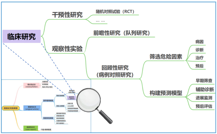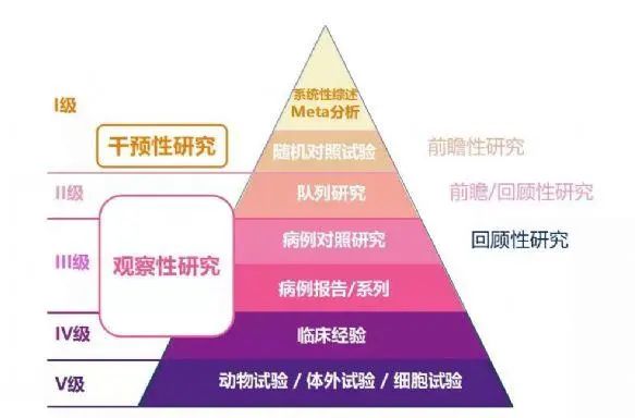 基层单位做纯基础的研究,选题不符合作者身份,容易令期刊编辑和读者生疑,“触礁翻船”事件屡屡爆出。 避开了高门槛的基础研究,大家本能地朝向那种“拿别人的数据,发自己的论文”的选项。所谓“达则细胞分子(湿实验),穷则Meta生信(干实验)”,从公共数据库“空手套白狼”的套路,被不少科研小白奉为救命稻草。 Meta分析广泛服务于临床决策,简单来说,就是把各处的小临床研究合并成一个大研究,评一评哪种诊疗方式更有效。由于模式相对固定,可以不停地替换病种来批量复制,Meta分析成为论文灌水的重灾区,近几年认可度极速下滑。依旧有国人在Lancet、JAMA等顶级期刊成功发表Meta,倒不是技法多高超,关键是选题有灵魂。 生信分析的内容体系比Meta庞杂,学起来费力一些,要想真正玩转,R语言、Python等编程软件是绕不开的,毕竟比起宏观的人群指标,微观分子的数据是海量的。 ▲Meta分析(左)与生信分析(右)的结果呈现形式(来源:文献截图) 如今生信分析也被贴上了标签,大有成为下一个Meta的颓势,许多SCI期刊陆续声明拒载纯生信分析的文章。如果添上一些自己的实验,做到“干湿结合”,就很受欢迎了,搭配方式为:生信分析提示相关+基础实验论证因果。 另外介绍一下相对小众的文献计量学。它浅显易懂,从文献库中检索关键字段,帮读者快速了解某个特定领域的作者、国家和研究机构的分布情况,以及热点和发展趋势。万物皆可计量,检索主题可以任何一种疾病、诊疗技术、标志物。我本科就是从文献计量学入门接触科研的,借此完成了第一篇SCI。这类论文偏向于情报学的范畴,被生物医学类杂志接收很考验运气,适合抱着为预选课题方向做调研报告的心态去完成。 以上这些论文类型被所有人都视为“捷径”时,你就要小心了。抄捷径的人多了,捷径还是捷径吗? 贴近日常工作发掘问题,既亲切,又稳妥。我要请出场的重头戏,正是临床研究型论文。 根据有无主动干预行为,临床研究分为干预性和观察性两大类。干预性研究的代表,是临床证据金字塔上的明珠——随机对照试验(RCT)。 ▲ 循证医学的证据等级金字塔 干预性研究本就不容易组织,加之检验科的专长在“诊”不在“疗”,接触不到患者干预过程的一手信息,不如做些力所能及的观察性研究。