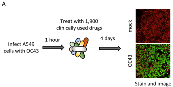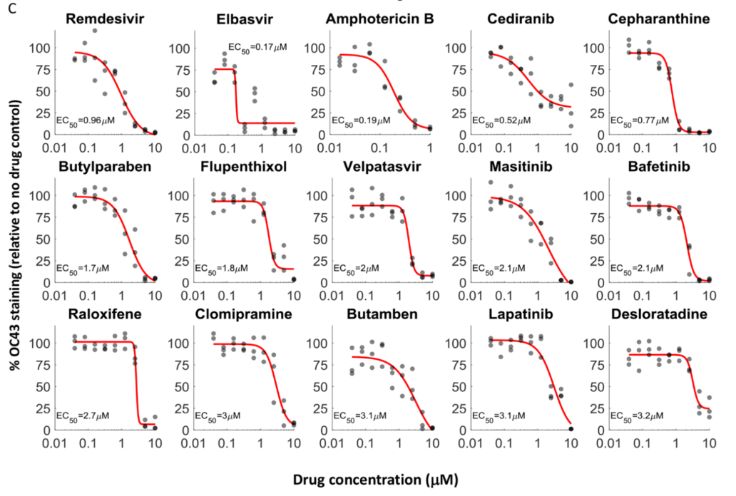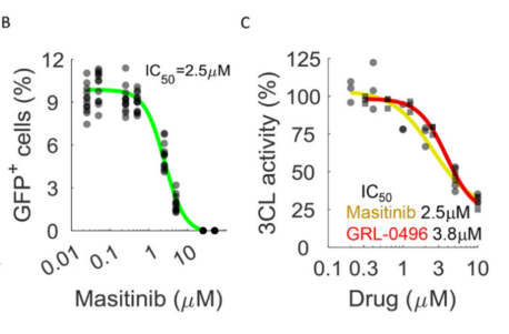 尽管新冠疫苗正在全世界广泛接种,有效遏制了新感染人数不断上升的趋势,但同时也面临着病毒变异导至疫苗保护效果下降的问题,在短期内,新冠病毒还将持续威胁着我们的健康。 除了疫苗这个有效对抗病毒的武器之外,科学家也一直在寻找能够抑制病毒复制的药物,而芝加哥大学的研究人员最近就发现了一种药物能够高效抑制新冠病毒的复制:马赛替尼,相关成果已发表于本周的Science杂志。 新冠病毒基因组包含有三万多个碱基,编码了约30个蛋白,其中16个蛋白以2条多蛋白(多个蛋白连接在一起)的形式存在,需要病毒自身携带的蛋白酶3CLpro将这些多蛋白分解为单个蛋白,才能发挥这些蛋白的功能,进而完成病毒的复制周期。这个蛋白酶在多种冠状病毒中均存在,而且对于病毒的复制起着关键作用,是一个开发抗病毒药物的好靶点。 芝加哥大学的研究团队使用了同属冠状病毒但毒力很低,仅会造成普通感冒的OC43冠状病毒来进行药物筛选,共筛选了1900种目前临床使用的或正在进行临床实验的,安全性较好的药物。筛选实验重复了两次(筛选流程见图1),发现了108种药物能够降低OC43的感染能力,研究者选取了效果最好的一些药物,包括瑞德西韦、两性霉素B、艾尔巴韦、马赛替尼、巴非替尼、测定了其EC50(半数抑制浓度),这些药物对OC43的EC50在0.17-7μM之间。 图1. 药物筛选流程 图2.对OE43冠状病毒效果最好的一些药物的EC50测定 随后,研究者又用相同的实验方法,测定了这些药物对新冠病毒的抑制能力(图3),结果显示,对OC43抑制最强的艾尔巴韦和两性霉素B,对新冠病毒没有抑制效果;而瑞德西韦和马赛替尼等20个药物,显示了较好的抑制新冠病毒的活性。 图3. 候选药物对SARS-CoV-2的EC50测定。