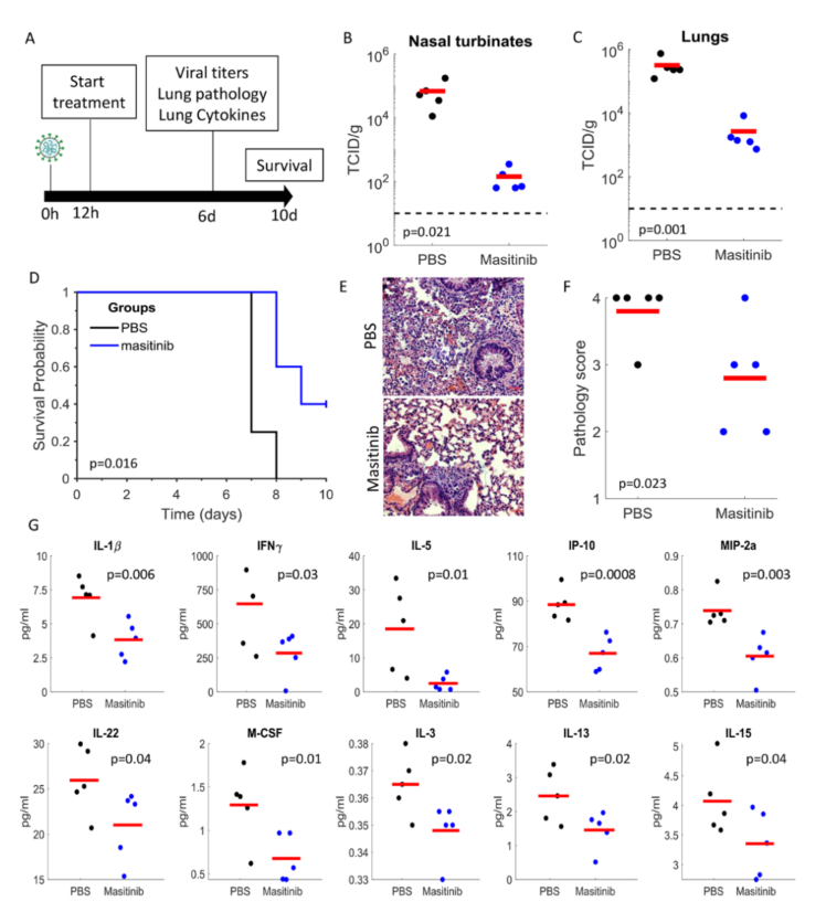 前面讲到,新冠病毒的3CL蛋白酶是一个较好的药物开发靶点,研究人员接下来就测试了这20中药物中是否能够靶向3CL蛋白酶。作者采用了FlipGFP和荧光素酶两种方法来研究3CL的抑制效果,发现其中效果最强的就是马赛替尼,几乎可以完全抑制细胞内3CL的活性,对3CL的IC50为2.5μM左右(图4),与对新冠病毒的半数抑制浓度3.2 μM接近。而且马赛替尼对多种新冠流行毒株如B.1.1.7, B.1.351和P.1都有很好地抑制作用。为了进一步确证马赛替尼作用于新冠病毒3CL蛋白酶,研究人员还获得了马赛替尼和3CL蛋白酶共结晶的晶体结构,显示马赛替尼作为竞争性抑制剂,直接结合在3CL的活性位点。 图4. 马赛替尼能够抑制新冠病毒的3CLpro蛋白酶 马赛替尼是一种可以口服的c-kit抑制剂,已经被批准治疗狗的肥大细胞瘤(一种在狗中最常见的皮肤恶性肿瘤),同时也在人体上进行临床2期和3期试验来评估治疗肿瘤、哮喘的作用。 接下来,研究者在包含人源ACE2(新冠病毒的受体)的转基因小鼠中,评估了马赛替尼在体内的抗病毒活性。结果显示,马赛替尼能够降低小鼠鼻腔和肺脏中新冠病毒含量99%以上(图5),肺部病理显示马赛替尼治疗组的病变程度也明显低于对照组;在生存实验中,马赛替尼治疗组的存活率也显著高于对照组;新冠病毒感染后对人体造成的损伤与过度激活人体的免疫系统密切相关,研究者也检测了多种细胞因子的水平,结果显示马赛替尼治疗组的小鼠中,这些细胞因子的表达均现在低于对照组,表明马赛替尼具有良好的体内抗新冠病毒活性。 图5. 马赛替尼可以显著降低小鼠体内的新冠病毒含量,同时降低多种炎症因子水平 随着疫苗接种的推进和新药物的不断开发,希望我们能早日完全控制住新冠病毒,让世界恢复正常! 参考文献: N. Drayman et al., Masitinib is a broad coronavirus 3CL inhibitor that blocks replication of SARS-CoV-2,Science 10.1126/science.abg5827 (2021). https://science.sciencemag.org/content/early/2021/07/19/science.abg5827 |