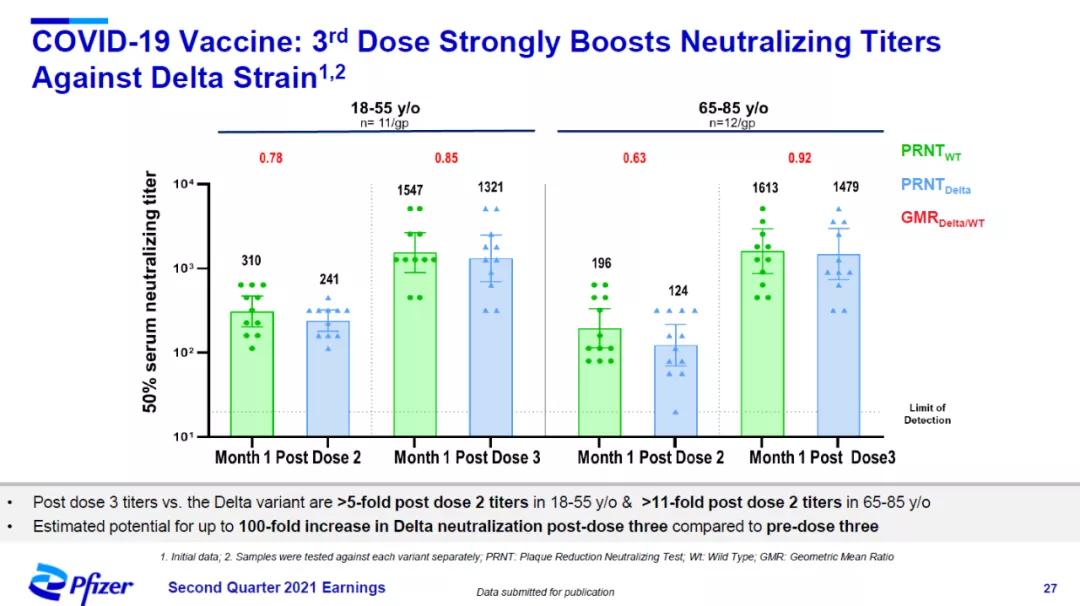 4)针对Delta变种,接种第三剂疫苗后的中和抗体滴度在18-55岁成人中提高5倍以上,在65-80岁老年人中提高11倍以上。