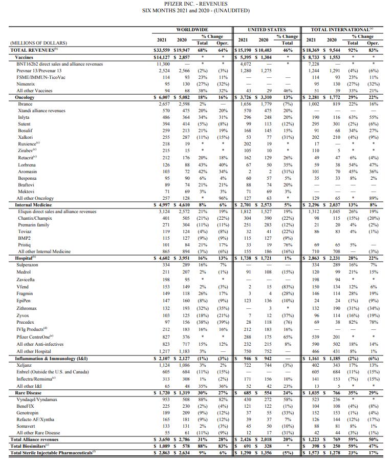 7月28日,辉瑞公布了其2021年第二季度财报,Q2营收189.77亿美元,上半年总收入335亿美元,同比增长68%,预计全年营收将达到800亿美元。 从具体产品来看: 基于疫情的蔓延,新冠疫苗需求持续增加,辉瑞和BioNTech合作的mRNA新冠疫苗BNT162b2持续放量,成为辉瑞销量最高的产品,Q2营收78 亿美元,占比Q2总收入超过40%,上半年营收113亿美元,占比上半年营收34%。 根据截至2021年7月中旬签订的合同,该疫苗预计今年全年将交付21亿剂。此前辉瑞/BioNtech对疫苗的销售预期为260亿美元,目前辉瑞上调全年销售额预期到335亿美元。而基于药王Humira在2020年全年营收198.32亿美元,预计BNT162b2或将超过Humira,成为新一代“药王”。