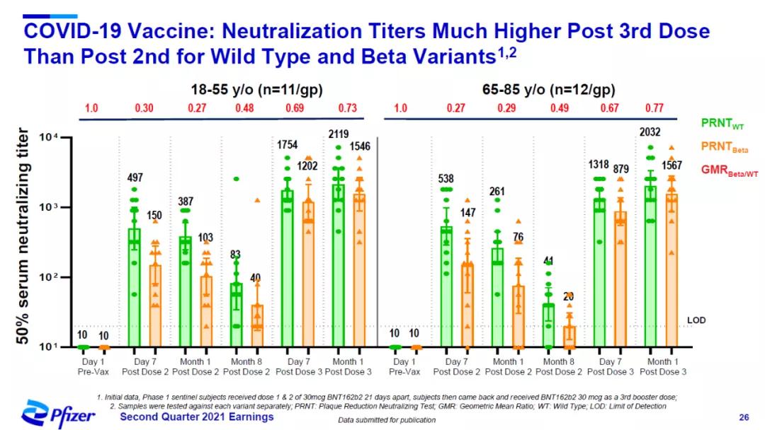 图表来源:医药笔记 此外,辉瑞还公布了接种第三剂BNT162b2后血清中和活性数据。初步数据显示:1)在接种第二剂6个月之后,接种第三剂增强疫苗表现出与此前一致的安全性特征; 2)针对野生型病毒,接种第三剂疫苗后中和抗体滴度比二针剂提高5-8倍; 3)针对Beta变种(B.1.351),接种第三剂疫苗后的中和抗体滴度比二针剂提高15-21倍;
