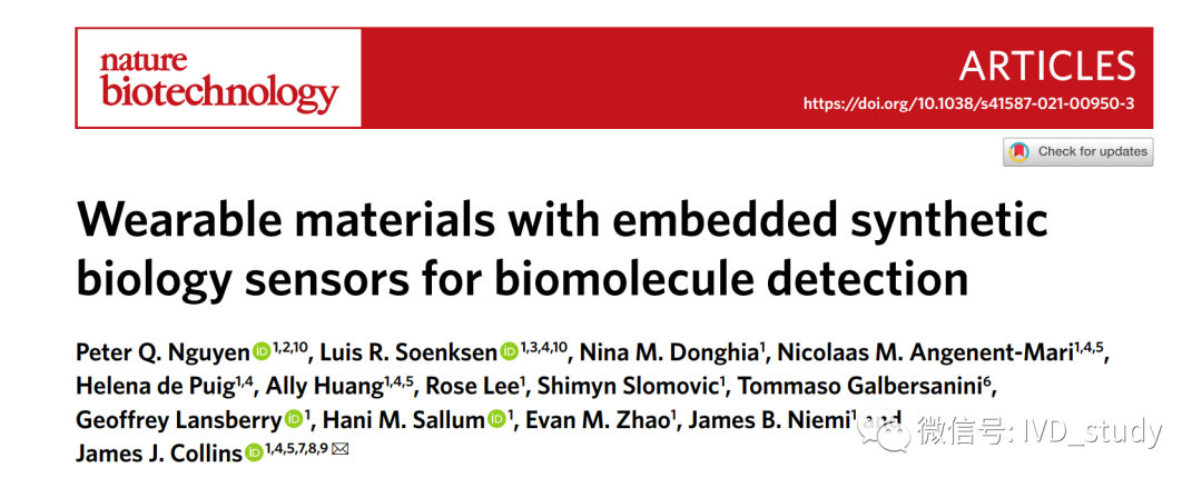 | 2021年6月28日,哈佛大学Wyss生物启发工程研究所和麻省理工学院的研究人员在 《Nature Biotechnology》发表了题为《Wearable materials with embedded synthetic biology sensors forbiomolecule detection》的研究论文。该研究开发了一种基于CRISPR技术的可穿戴的合成生物学生物传感器,用以检测环境中的病原体和毒素,并通过发出荧光警告穿戴者。而且,研究团队还将这一技术集成到了标准口罩中,以检测患者呼吸中,以及空气中是否存在新冠病毒(SARS-CoV-2)。据报道,该方法核酸的检测极限可与定量PCR等现有实验室方法相媲美,灵敏度达500拷贝。该面罩可在室温内佩戴,无创检测SARS-CoV-2,不需要用户干预,只需按下按钮,90分钟后便可知结果。 呼吸道飞沫和气溶胶是呼吸道传染病的传播途径,目前基于呼吸的传感器研究主要集中在使用电化学传感器或下游质谱分析检测感染患者体内的挥发性有机化合物或生物标记物,这些方法在使用推广中存在一定的难度。