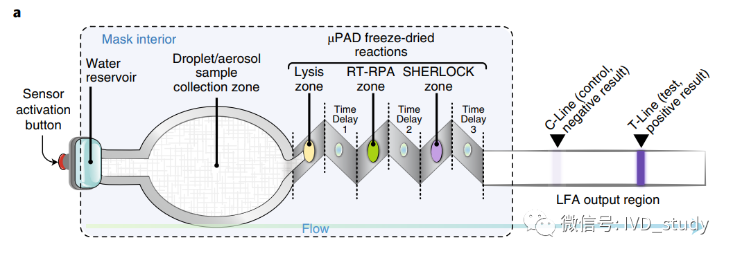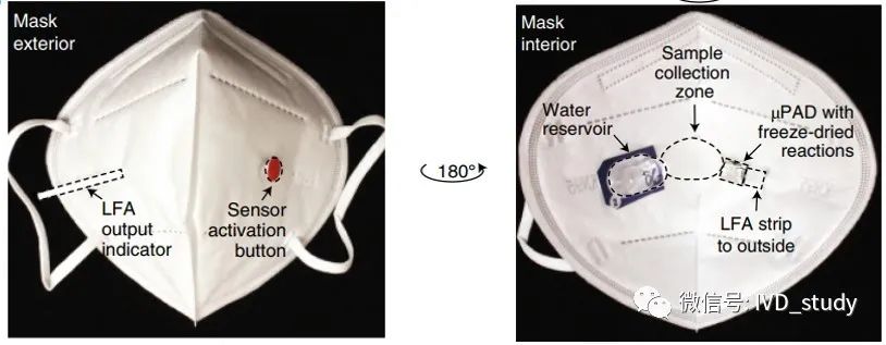由于咳嗽、说话或正常呼吸,病毒会积聚在口罩内部,研究团队设计了一个包含四个模块组件的面罩传感器:用于水合作用的储液器、大表面积的样本采集垫、蜂巢形的μPAD反应区(基于微流控的反应设备)和侧向层析试条(LFA)。 工作四模块 每个模块都可以面向外部或面罩内部,除了收集垫外,收集垫必须放置在面罩内部,面向患者的口鼻。毛细作用将任何收集的液体和病毒颗粒从样品收集垫吸住到μPAD,μPAD包含裂解、扩增和检测等。每个反应区由聚乙烯醇(PVA)隔开,每两个反应区之间的孵育时间可调。 口罩结构