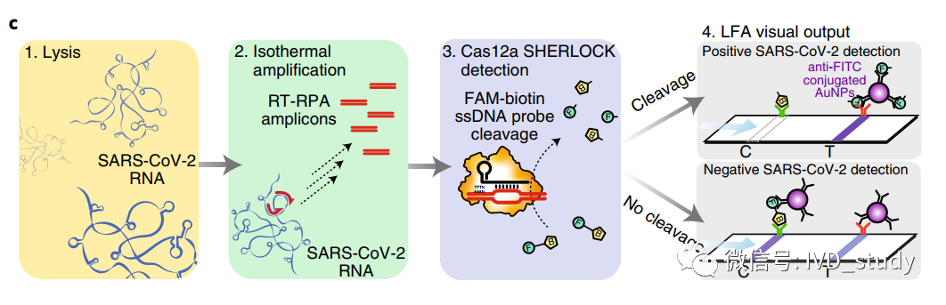 第一μPAD反应区包含冻干的裂解试剂,包括已知的裂解病毒膜的组分。 第二个μPAD反应区是一个逆转录-重组酶聚合酶扩增(RT-RPA)反应区,包含一个定制的恒温扩增反应,用于靶向SARS-CoV-2 S基因的非重叠区域。 最后的μPAD反应区包含一个Cas12a-SHERLOCK传感器,该传感器具有用于检测扩增的dsDNA扩增子的优化gRNA。在SARS-CoV-2衍生的扩增子存在下,活化的Cas12a能够使共冻干的6-FAM发生反式切割-生物素ssDNA探针。 为了实现简单视觉读数,使用侧向层析试条进行检测。这部分不再细说了,目前分子的可视化检测,绝大多数都是基于此种方法。