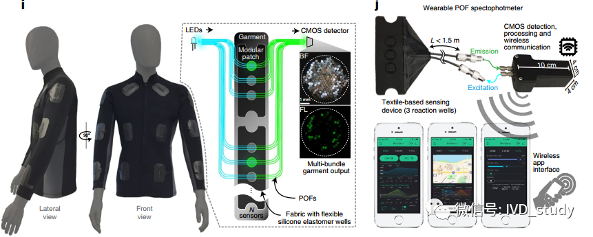 原理图 应用拓展,除了口罩外,研究团队将光纤网络集成到以上技术中,以此定量检测生物反应产生的荧光,产生一个更客观、更令人信服的定量数据,并且这个数字信号还可以发送到一个智能手机应用程序中,让佩戴者实时监控自己接触的各种物质。与此同时,它还具有多种检测功能,例如病原诊断、危险化学品试剂检测和神经毒气检测等等,适用于各种应急人员和应急部门。 可穿戴设备