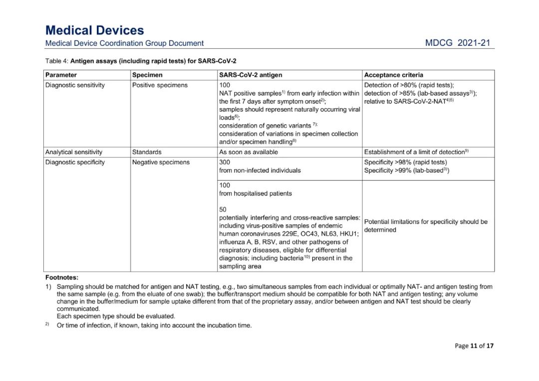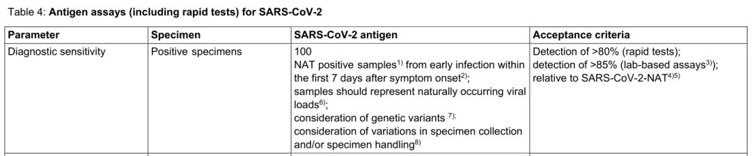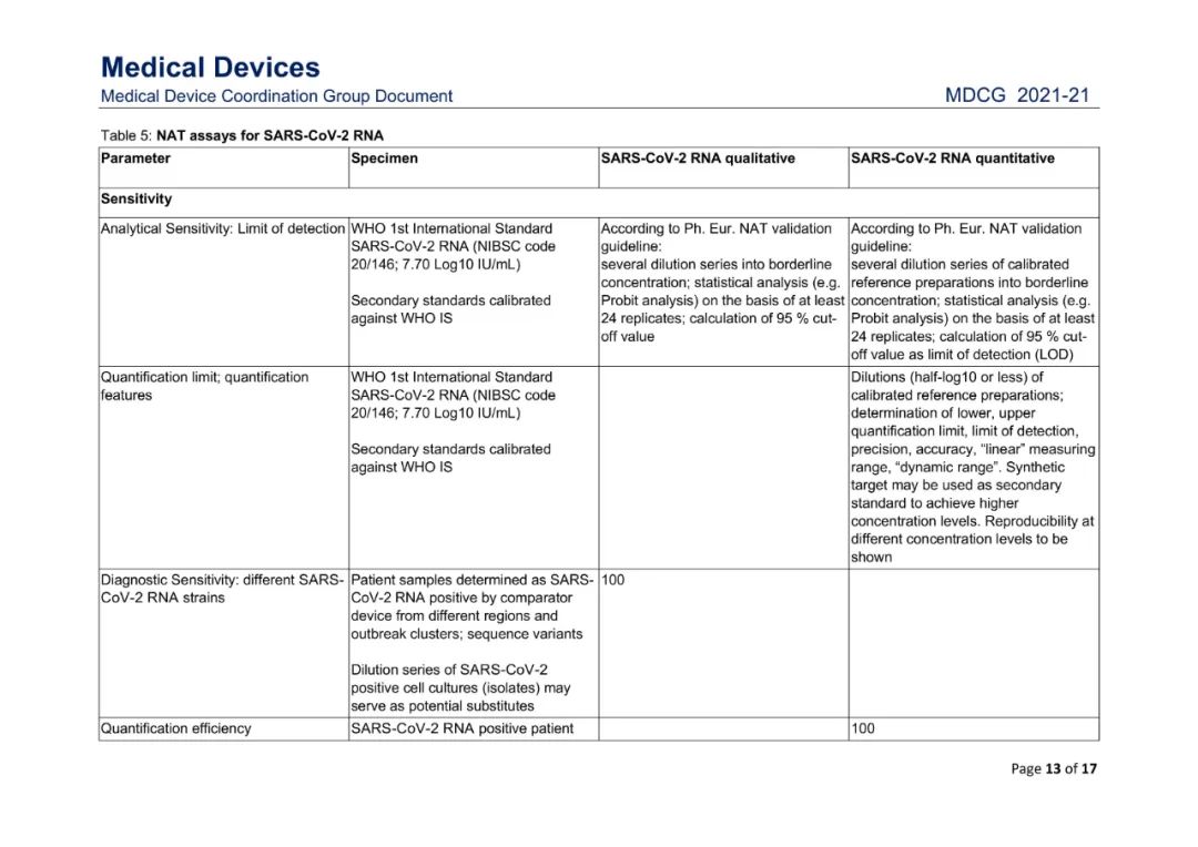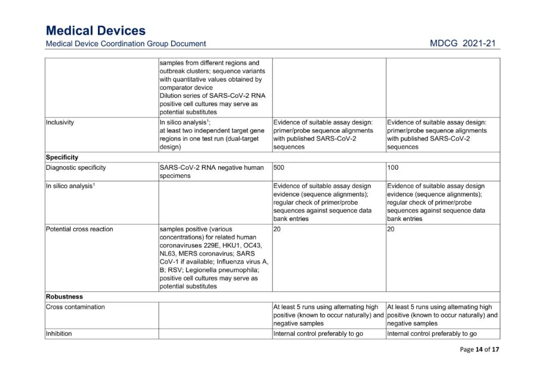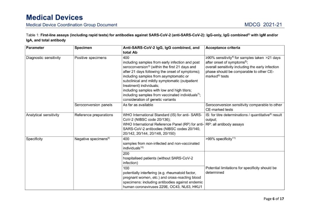 该指南涉及在IVDD 98/79/EC或IVDR (EU) 2017/746下SARS-CoV-2 IVD产品的性能评估,覆盖了各类针对新冠的核酸检测试剂、抗原试剂以及抗体试剂的详细要求,如样本要求、接受标准等,如下表所示。制造商、公告机构、主管当局和授权代表等各利益相关方均可参考使用。