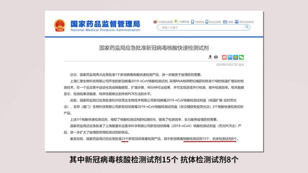摘要: 截至2020年3月27日,国家药监局已经应急批准23个新型冠状病毒检测产品。其中新冠病毒核酸检测试剂15个,抗体检测试剂8个。病毒核酸检测,其实就是对病毒的遗传物质RNA进行检测。目前主流方法为实时荧光 RT-PCR 法, ...