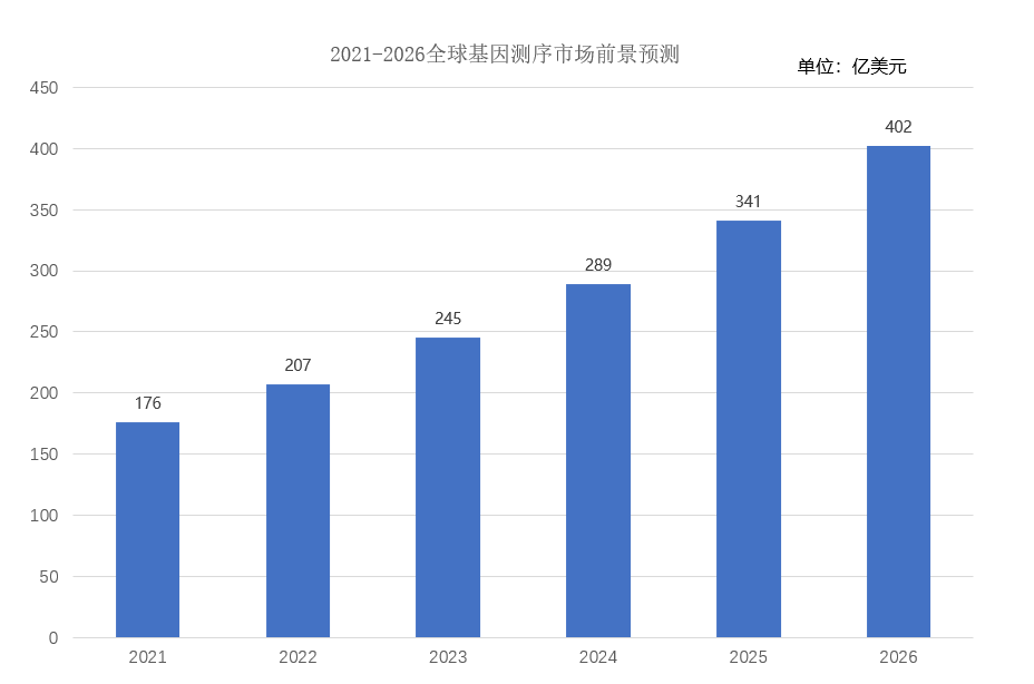根据 BCC Research,全球基因测序市场于2018年达到107亿美元,预计未来几年依旧会保持快速增长,2023年将达到245亿美元,2018-2023年复合增长率为18%;其中,基因测序服务市场规模将由 2018年的55亿美元增长到 2023 年的 140 亿美元,复合增长率为 20.4%。中国基因测序市场规模于 2017 年达到12亿美元,预计2022年将达到29亿美元,复合增长率为19%;其中基因测序服务市场规模将于2017年的6.18 亿美元增长到 2022年的18 亿美元,复合增长率为24.4%。