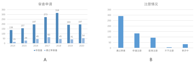 图1|创新产品特别审查申请情况。A、审查申请情况;B、注册情况