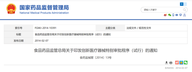 2014年,国家药监局发布了《创新医疗器械特别审批程序》(试行)。