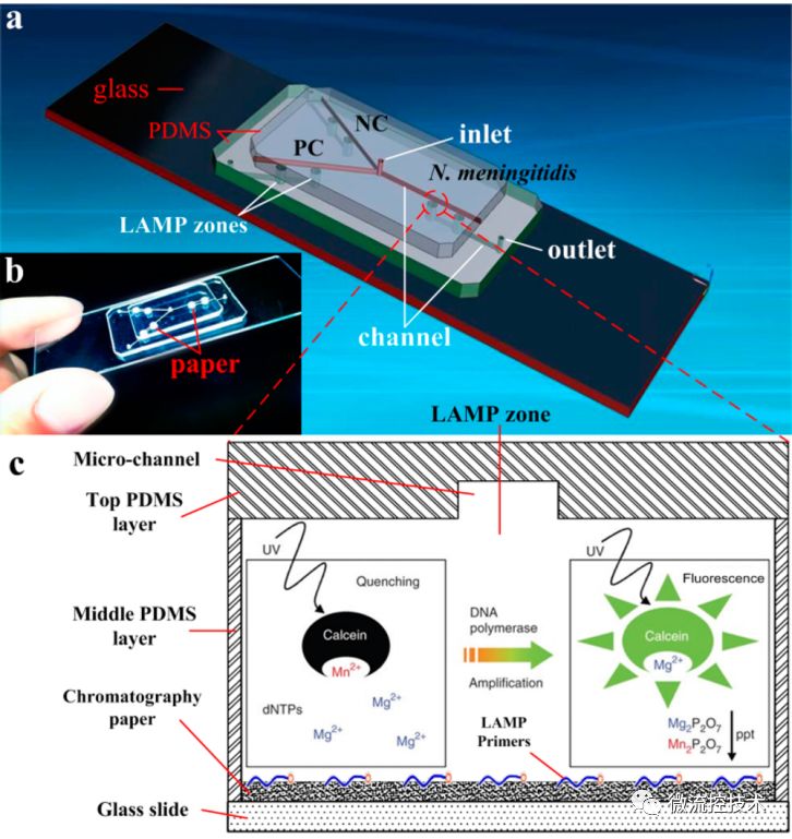 Dou等研发了一种PDMS-纸混合微流控装置,PDMS不用复杂的表面处理,无大型设备,将“纸”的技术引入到微流控LAMP装置中。该装置包括三层,两个PDMS层和一个玻璃载片底层。首层PDMS用于试剂递送,包含三个微通道和一个加样入口。中间PDMS层由底部的6个孔道组成,作为LAMP反应区。底层为用于支撑的玻璃载片。该装置可以在45min内检测最低为3个拷贝的脑膜炎奈瑟氏球菌。