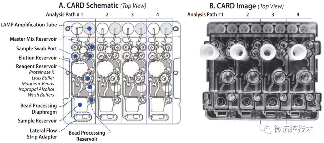 美国Rheonix公司开发的基于微流控技术的 CARD 芯片,该芯片集成泵、阀门、微通道、反应和试剂储液池,以及通用DNA阵列。CARD芯片采用聚苯乙烯均聚物注塑而成,可以用于免疫检测和核酸检测。Chen 等可在60min内,使用 CARD 芯片提取人类免疫缺陷病毒(HIV)RNA ,20min内完成进行 RT-LAMP 检测,分析灵敏度可达每毫升 103 病毒颗粒(103vp/mL)。此外,台式 RT-LAMP 和 CARD 芯片上的分析结果显示加入病毒与结果CT值的一致性,说明CARD芯片具有与劳动密集型的台式LAMP同样的处理能力。