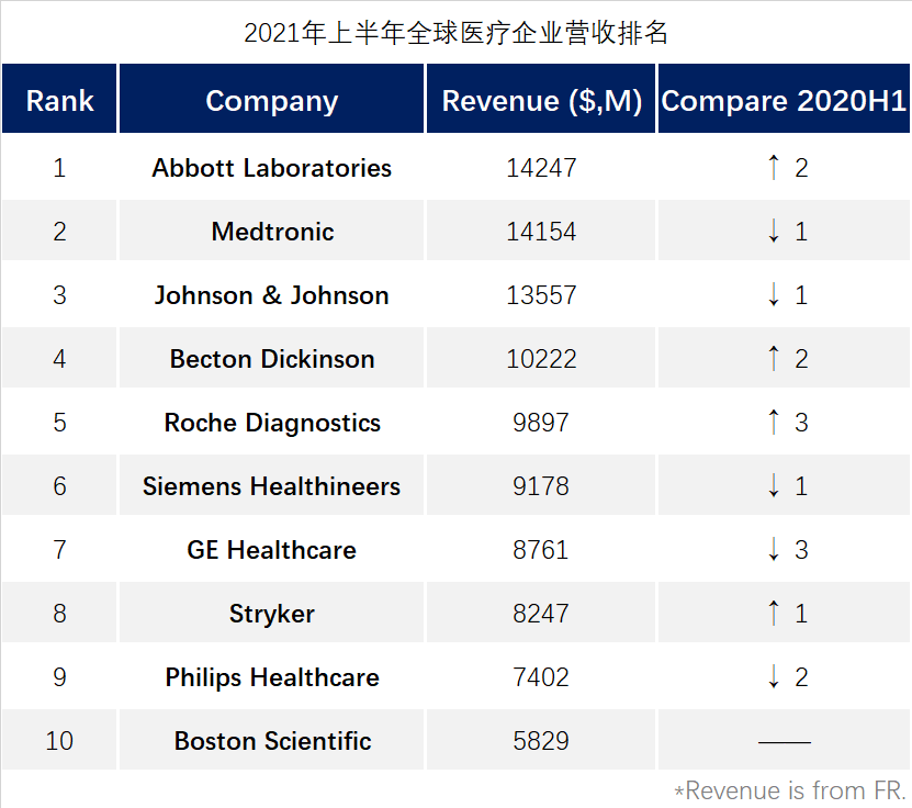 2021上半年全球顶级医疗企业TOP10最新出炉:雅培超越美敦力,碧迪跻身TOP5