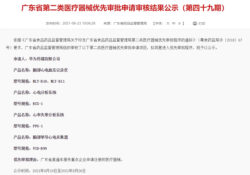 8月23日,广东省药监局公布第二类医疗器械优先审批申请审核结果。公告显示,华为公司腕部心电血压记录仪、心电分析系统、心率失常分析系统、腕部单导心电采集器4个医疗器械产品进入了优先审批程序公示。从智能手表到医疗器械,此次进入优先审批说明,华为的可穿戴医疗产品做得越来越专业了。