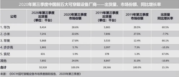 据《IDC中国可穿戴设备市场季度跟踪报告,2020年第三季度》显示:在中国市场,华为2020年第三季度的可穿戴设备份额达到了28.6,占据第一,小米、苹果分获二三位。
