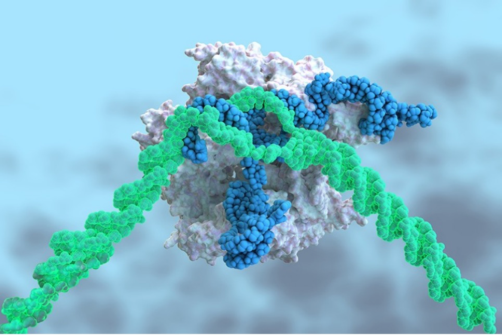 CRISPR-Cas9复合物的三维图示,CRISPR-Cas9复合物(白色和蓝色)可以切割DNA(绿色),使导至疾病的基因失效。