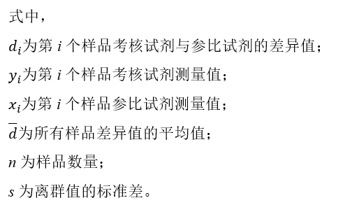 本部分主要针对厂家的应用。 2.4.2 测试方法 A、目的 生产厂家必须建立定量测定某种待测物的考核试剂同一个参比试剂间的关系,理想状态下选用JCTLM推荐的参比试剂。 然而,有时一个新的考核试剂的分析性能会优于参比试剂,例如,使用自动本外诊断程序替代微孔板的手动程序。 在这类情况下,主要目的是建立两种程序间的偏倚。 B、样品要求 比对应使用未经处理的患者样品,分析物浓度应尽可能在测量范围内均匀分布。 应记录样品信息,例如,基本信息,临床诊断和样品状态(是否存在脂血、溶血、黄疸、浑浊)。尽量保存足够的样品供重复测定。 如需使用处理过的样品(如添加高浓度样品),应少于比对样品总数的20%。任何处理过的患者样品都需要在结果中注明。 C、样品储存 必须保证由于运输或储存条件的变化不会影响任何一个考核试剂。在考核试剂和参比试剂使用的分装样品在储存和处理上应尽可能一致。 D、样品数量 体外诊断试剂生产厂家用于建立或确认声明标准的,样品数量应不少于100份,不同情况下进行比对研究的样品数量要求详见表1。 如果两种考核试剂对于两个临床相关人群的检测关系存在差异,则每一个人群均需要至少100份样品的研究。 这种差异需要在厂家产品标识或在临床文献中表述。 例如,两个免疫检测试剂可能对于妊娠期女性样品具有一种相关性,而对于男性样品具有另一种相关性,可能两种人群的交叉反应物浓度存在差异,从而对两种考核试剂产生不同的影响。 另一个例子是检测甲状旁腺激素的两种考核试剂可能在检测正常肾功能患者样品时非常相近,而在检测透析患者样品时差异很大。 表1|EP09-A3对厂家和实验室比对研究样品的数量要求 E、测试次数 用于确认声明的标准,重测1次;如果是其他用途,可重测1次或多次。 F、测量区间 对于体外诊断产品生产厂家而言,建立和声称确认的研究都是确定考核和参比试剂在最宽的检测区间的关系。需要收集考核试剂在整个测量区间的样品,而不仅仅是参考区间或医学决定水平。 G、测量时间和期限 对于一个给定的样品,考核试剂和参比试剂应在待测物稳定的时间段内进行测试。 如果可能,最好使用当天的样品进行测试。 如果使用储存的样品,应确保样品的稳定性,以满足参比试剂和考核试剂的要求。 两种程序的测量样品需要以相同方式保存,以避免储存条件不同引入新的变量。 H、测量顺序 参比试剂和考核试剂应按随机顺序测定每批样品。 I、数据收集期间的检查和质控 数据收集期间需要进行检查,防止出现错误。实验中必须遵循合适的质控(QC)程序,保留质控图。 J、参比试剂的选择 最好能溯源至标准物质或参比试剂。然而,有很多产品并没有参比试剂,也没有参考物质,无法溯源至SI单位,没有办法进行标准化,而只能进行一致化。可以选择市场上已有的产品或者接受度较好的非同种方法与待测物产品进行比较。 2.4.3数据处理和分析 体外诊断试剂厂家可基于EP09-A3叙述的基本程序对收集的数据作初步考察,并选用任何一种有效的统计方法分析数据,但最终应在有关医学决定水平上确定考核试剂与参比试剂之间的偏倚。 A、方法学比对与偏倚 对参比试剂和考核试剂的测定结果作图并进行目测检查。通过绘制偏差图、散点图初步判断样品浓度的分布情况并了解方法间差值变化情况,为此后选择何种统计方法进行更合理的评估作分析。 偏差图分为数值偏差图和排序偏差图,数值偏差图的x轴为参比试剂测量值,y轴为考核试剂与参比试剂的差异值或者差异值的百分比。 排序偏差图是对参比试剂的测量值进行排序,以序号为x轴,y轴为考核试剂与参比试剂的差异值或者差异值的百分比。对于程序间差值呈比例变化[恒定变异系数(CV)]者,排序偏差图更优。 散点图中,x轴为参比试剂结果,y轴为考核试剂结果。散点图可以表示因变量随自变量变化的大致趋势。 B、离群值检查 按照EP09-A3要求,通过广义极端学生化偏差(Extreme Studentized Deviate,ESD)方法检验离群点。具体步骤为: 1)根据100份样品的测定结果计算(y-x)/x的平均值和标准差,根据平均值和标准差计算最大偏倚ESD; 2)根据检验统计的样品量100计算临界值(λi); 3)若ESDi>λi,则认为该观察值为离群值,排除后进行第二个(i=2)最大偏倚比较; 4)离群值的个数是通过找到最大的i使得ESDi>λi; 5)排除离群值后补充数据,达到至少100例样品数量要求。 根据以上公式计算ESD,计算出所有可能的离群值。根据EP09-A3,离群值应不超过样品结果数量的5% (取整数),如果样品为112个,那么其离群值的数量(h)应不超过5个。 C、利用偏差图进行评估 对于恒定标准差(方法间差值较恒定)或者恒定CV(方法间差值呈比例变化)的偏差图,如果两种考核试剂间的差值呈正态分布则利用差值平均值作为估算偏倚。 如果两种程序间的差值呈非正态分布,则用中位数作为估算偏倚。 D、利用散点图进行线性拟合(回归分析) 临床实验室比对试验研究可以先进行偏差图分析,如果不理想再进行线性拟合回归分析。 但是厂家在建立和确认比对声明时,必须进行回归分析。 回归分析类型包含常规线性回归法(ORL)、加权最小二乘法(WLS)、Deming回归法和Passing-Bablok回归法。 E、医学决定水平处偏倚及回归 将医学决定水平浓度代人回归方程,确定其偏倚是否可接受。 2.5、其他正确度评价 通过对