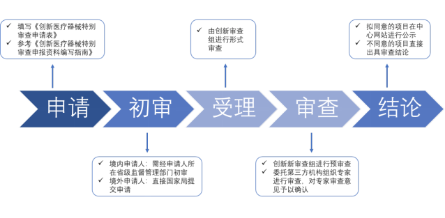 这是刘博谈注册的第六篇,在本篇中,我们来介绍创新医疗器械特别审查申报的流程和要求。 3、创新申报流程 图2 | 创新医疗器械申报流程图 从图2中,可以了解到,如果要申请创新医疗器械,首先需要填写《创新医疗器械特别审查的申请表》,同时应参考编写指南来准备申报资料。 当所有申报资料都准备好后,对于境内申请人,需要向申请人所在的省级监督管理部门提出初审申请;而对于境外申请人,直接向国家局来提交申请。 当器审中心收到了创新申请后,创新审查组会对这个产品进行形式审查,形式审查通过后,产品正式受理。 创新审查组会对产品进行预审查,并提出审评专家的方向,器审中心再委托第三方机构组织专家进行审查,并对专家的审查意见予以确认。 对于拟同意的项目,会在器审中心的官网进行公示,公示的时间不少于10个工作日。 对于不同意的项目,会直接出具审查结论。 对于没有CA的申请人可以通过医疗器械注册管理信息系统来提交创新的申请,而对于已经有CA的申请人,可以通过eRPS系统来直接提交申请。 申请人可以通过器审官网的办事大厅的审评进度查询来了解这个创新产品的审查结论,目前已经不会印发纸质版通知单。 4、申报 4.1、申报资料的要求 申报资料可以参考《创新医疗器械特别审批申报资料编写指南》,在指南中详细列出了申报资料中所需要包含的内容: 1) 创新医疗器械特别审查申请表 2) 申请人企业资质证明文件 3) 产品知识产权情况及证明文件 4) 产品研发过程及结果综述 5) 产品技术文件,至少应当包括: