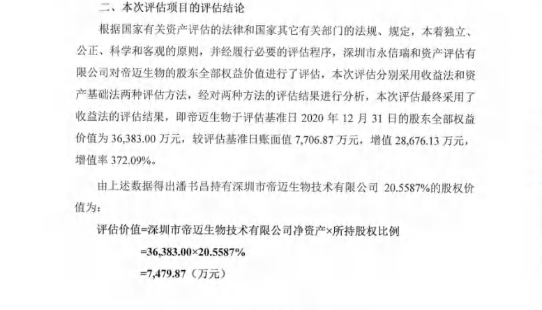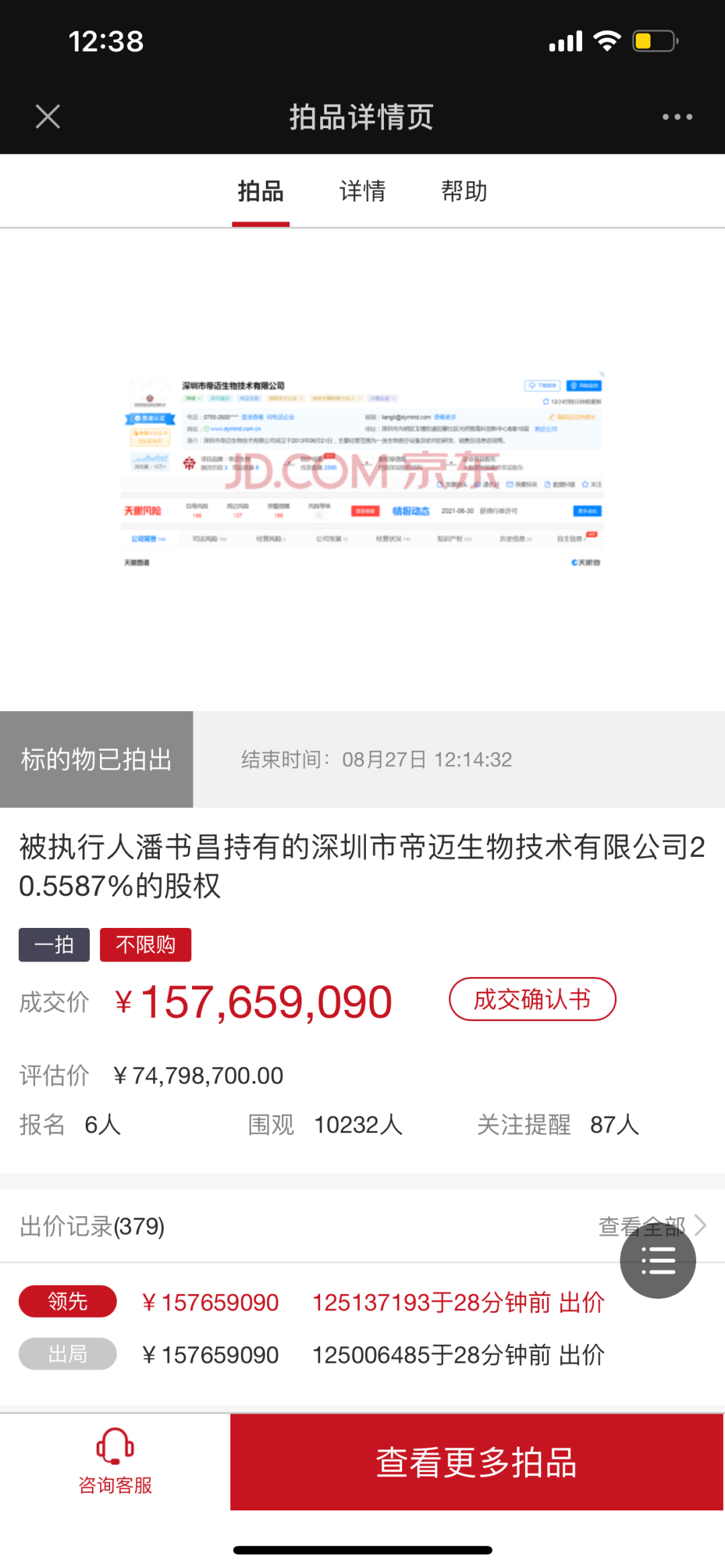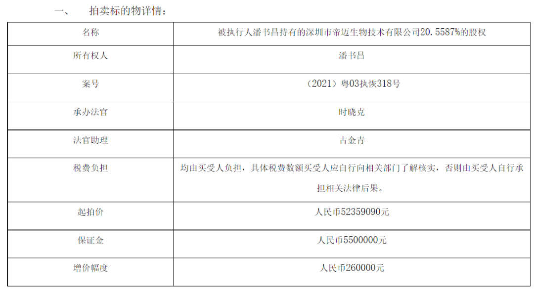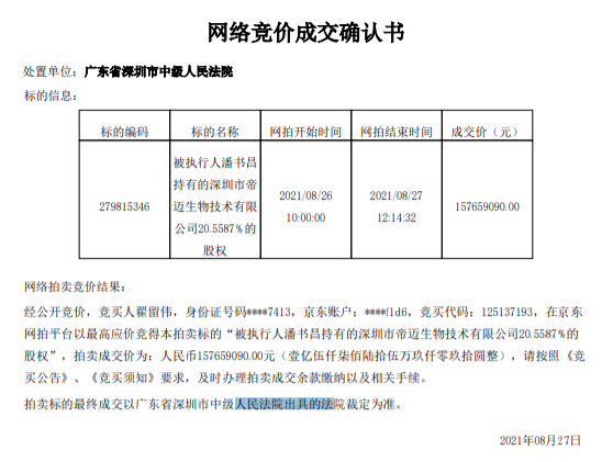 终于!! 成交价格 ¥157,659,090.00 帝迈生物20.55%股权刚刚在线拍卖成功! 这部分股权来自帝迈生物单一第一大股东潘书昌持有。起拍价格为5235.9万元,成交价格为1.57亿! 为何要拍卖第一大股东的股权呢? 原来是帝迈董事长翟留伟与潘书昌存在借款合同纠纷,由于潘书昌没有履行仲裁裁决生效法律文书确定的内容,所以申请强制执行,强制潘书昌偿付人民币 34,748,429.2 元及利息等。 在仲裁过程中,应申请执行人的申请,深圳市南山区人民法院依法保全冻结了被执行人潘书昌持有的深圳市帝迈生物技术有限公司20.5587%的股权。在执行过程中,法院依法向被执行人送达了执行通知、执行裁定书等相关法律文书。因被执行人未按执行通知要求在指定期限内履行生效法律文书确定的义务,申请执行人 向本院提出申请,要求处分上述财产以清偿债务。 遂法院按照国家相关法律裁定如下:强制拍卖、变卖被执行人潘书昌持有的深圳市帝迈生物技术有限公司 20.5587%的股权以清偿债务。 股权价值是如何算出来的? 根据拍卖附带的评估报告,法院聘请第三方机构对帝迈生物的股权价值做了科学评估,得出了帝迈生物股东全部权益的价值约为3.6383亿元。 关于帝迈 帝迈生物是一家专注体外诊断医疗器械及试剂研发、生产、销售、服务的国家级高新技术企业。作为联检一体机创新者,帝迈先后推出自主研发的血常规+CRP联检一体机、全球领先的五分类+三分类联检一体机,微量血全自动血常规+CRP联检一体机,血常规+CRP+SAA联检一体机,推动血细胞分析设备新突破,进一步提高医疗机构诊疗效率。 帝迈生物一直被资本市场看好,已获得了多轮融资,包括美康生物(天使轮,4000万元),元生创投(A轮,未知),红杉中国和金垣坤通(B轮,亿元以上)等,而帝迈生物近些年发展也一直势头不错。 |