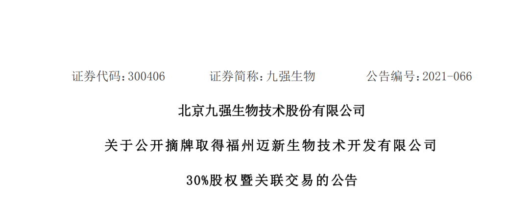 9月3日,九强生物晚间发布公告,通过北京产权交易所公开摘牌受让中国医药投资有限公司持有的福州迈新生物技术开发有限公司30%股权,摘牌价格为 94,750 万元。迈新生物为九强生物控股子公司,主要从事免疫组化诊断业务,交易将提高九强生物对迈新生物的持股比例。 回顾 8月3日,中国医药投资有限公司将其持有的福州迈新生物技术开发有限公司30%的股权在北京产权交易所挂牌交易,挂牌价格9.475亿元。此次挂牌价格较去年国药投资与九强生物(300406.SZ)联合收购迈新生物时的8.25亿元,增加1.225亿元,增幅14.85%。 九强生物在8月3日的互动易问答表示,对此次国药投资挂牌的迈新生物30%股权会争取收购。早在2020年年报中九强就表示,2021年将抓住行业整合的机遇,利用上市公司的优势,继续稳步推进福州迈新生物少数股权的收购,同时积极拓展新产品线的收购显然,显然九强生物对国药此次挂牌的迈新生物30%股份,志在必得。 在这场交易完成之后,九强生物业务将进一步覆盖肿瘤细胞筛查和手术后肿瘤组织切片的临床诊断领域,扩充病理诊断试剂和仪器产品线,提升技术研发能力和营销网络布局,巩固上市公司在体外诊断产业的领军地位。同时,此次迈新的股权转让也是国药入主九强生物后,快速强化九强生物,使其成为国药唯一的IVD平台。 强强联手效果显著,九强生物今年利润可能超5亿 九强生物是一家以生化诊断试剂的研发、生产和销售为主营业务的高成长型企业,拥有与国际基本同步发展的系列产品。迈新是中国肿瘤病理免疫组化诊断试剂的领先者,是一家生物医药高新技术企业。2020年9月,九强生物以18亿元的价格收购迈新生物65.55%的股权,成为迈新生物控股股东。作为国内免疫组化细分领域的领先企业的迈新生物,是中国肿瘤病理免疫组化诊断试剂的领先者,主导产品为免疫组化检测仪器和系列试剂,业务覆盖肿瘤病理诊断、免疫细胞化学诊断、分子病理诊断、精准医学诊断四大领域。此外,迈新生物也是国内第一家取得NMPA三类医疗器械生产许可证的免疫组化产品生产企业,2016年国内首台自主研制的全自动免疫组化染色系统成功上市,持续引领国内免疫组化行业发展。通过双方的优势互补,利好双方的长远发展,对九强生物提升检测业务的服务水平和竞争实力具有重要意义。 根据北交所披露福州迈新生物技术开发有限公司30%股权项目情况显示,迈新生物2021年上半年实现净利润1.25亿元,已经接近于2020年全年1.54亿元的利润。8月27日,九强生物披露2021年半年报。报告期内,公司实现营业收入8.08亿元,同比增长204.49%;归属于上市公司股东的净利润2.21亿元,同比增长547.62%。受益于生化血凝业务持续加速,迈新生物并表后贡献高成长。随着,国内新冠肺炎疫情得到控制,医疗机构恢复正常诊疗秩序,九强生物业务实现快速增长。一方面,公司传统的生化及血凝业务充分借助国药的产业渠道资源,业务增长持续加速;另一方面,公司子公司迈新生物免疫组化业务持续放量,以上两方面支持今年九强生物的业绩确定有高增长。 迈新承诺2年净利不低于3.4亿,肿瘤行业迎来发展契机 2020年6月,九强生物与迈新生物签署了《购买资产协议之补充协议暨业绩承诺补偿协议》,业绩承诺期为2020年、2021年,合计实现的净利润不低于34,282.14万元。根据立信中联会计师事务所(特殊普通合伙)出具的《福州迈新生物技术开发有限公司审计报告》,迈新生物2020年实现净利润15,233.86万元。2020年度实际净利润与承诺净利润相比,实现率为105.28%,2020年度业绩承诺已实现。 世界卫生组织国际癌症研究机构(IARC)发布了2020年全球最新癌症负担数据。预估了全球185个国家36种癌症类型的最新发病率、死亡率情况,以及癌症发展趋势。2020年全球新发癌症病例1929万例,其中中国新发癌症457万人,占全球23.7%,由于中国是世界第一人口大国,癌症新发人数远超世界其他国家。2020年全球癌症死亡病例996万例,其中中国癌症死亡人数300万,占癌症死亡总人数30%,主要由于中国癌症患病人数多,癌症死亡人数位居全球第一。 目前,中国的癌症发生率正在不断攀升,癌症已成为威胁国人生命健康的首要原因。随着医学事业的发展,肿瘤的诊治在创新技术、转化研究等诸多方面也取得很大进展,特别是在精准医学、个体化治疗时代,众多癌症患者已从靶向治疗中极大获益。病理诊断是公认的肿瘤诊断“金标准”,是目前任何手段都无法替代的终末诊断,也是指导临床治疗和预后评估最可靠的依据。病理诊断通过分析肿瘤的不同病理类型、基因突变状况、不同分期以及患者的身体状况,制定相应的个体化方案,提升临床治疗效果,这也将成为未来肿瘤诊疗的重要发展方向,关系精准治疗的成败。迈新生物自1993年成立,便勾勒出免疫组化技术走进每一个病理科的美好蓝图,致力推动IHC质量控制和标准化进程。迈新生物坚持科研创新,自主研发国内首台全自动病理染色系统,打破国外垄断,让“国产替代”不再停留在口头上。伴随着病理事业的发展,免疫组化技术在病理医生的日常诊断中发挥着日益重要的作用,而迈新生产出的每一台自动化仪器、每一支抗体,将直接关系着病理诊断结果,关系着肿瘤患者的生命健康。此外,迈新生物目前拥有40个III类注册证和400+个诊断用抗体,位居免疫行业领先水平。其自主研发的全自动免疫组化染色