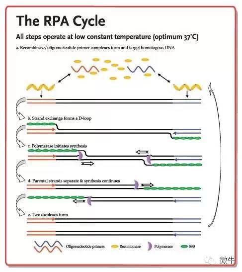 基本原理 重组酶聚合酶扩增(Recombinase Polymerase Amplification,RPA),被称为是可以替代PCR的核酸检测技术。RPA技术主要依赖于三种酶:能结合单链核酸(寡核苷酸引物)的重组酶、单链DNA结合蛋白(SSB)和链置换DNA聚合酶。这三种酶的混合物在常温下也有活性,最佳反应温度在37°C左右。 重组酶与引物结合形成的蛋白-DNA复合物,能在双链DNA中寻找同源序列。一旦引物定位了同源序列,就会发生链交换反应形成并启动DNA合成,对模板上的目标区域进行指数式扩增。被替换的DNA链与SSB结合,防止进一步替换。在这个体系中,由两个相对的引物起始一个合成事件。整个过程进行得非常快,一般可在十分钟之内获得可检出水平的扩增产物。 图片来源:Isothermal amplifieddetection of DNA and RNA 引物设计 RPA分析的关键在于扩增引物和探针的设计。PCR引物多半是不适用的,因为RPA引物比一般PCR引物长,通常需要达到30-38个碱基。引物过短会降低重组率,影响扩增速度和检测灵敏度。在设计RPA引物时,变性温度不再是影响扩增引物的关键因素。RPA的引物和探针设计不像传统PCR那样成熟,用户需要自己摸条件进行优化。 优势 常规PCR必须经过变性、退火、延伸三个步骤,而PCR仪本质上就是一个控制温度升降的设备。RPA反应的最适温度在37℃-42℃之间,无需变性,在常温下即可进行。这无疑能大大加快PCR的速度。此外,由于不需要温控设备,RPA可以真正实现便携式的快速核酸检测。 据介绍,RPA检测的灵敏度很高,能够将痕量的核酸(尤其是DNA)模板扩增到可以检出的水平,从单个模板分子得到大约1012扩增产物。而且RPA还用不着复杂的样品处理,适用于无法提取核酸的实地检测。 RPA既可以扩增DNA也可以扩增RNA,还省去了额外的cDNA合成步骤。你不仅可以对扩增产物进行终点检测,还可以对扩增过程进行实时监控,甚至可以通过试纸条(侧流层析试纸条LFD)读取结果。 RPA可以用来干什么?