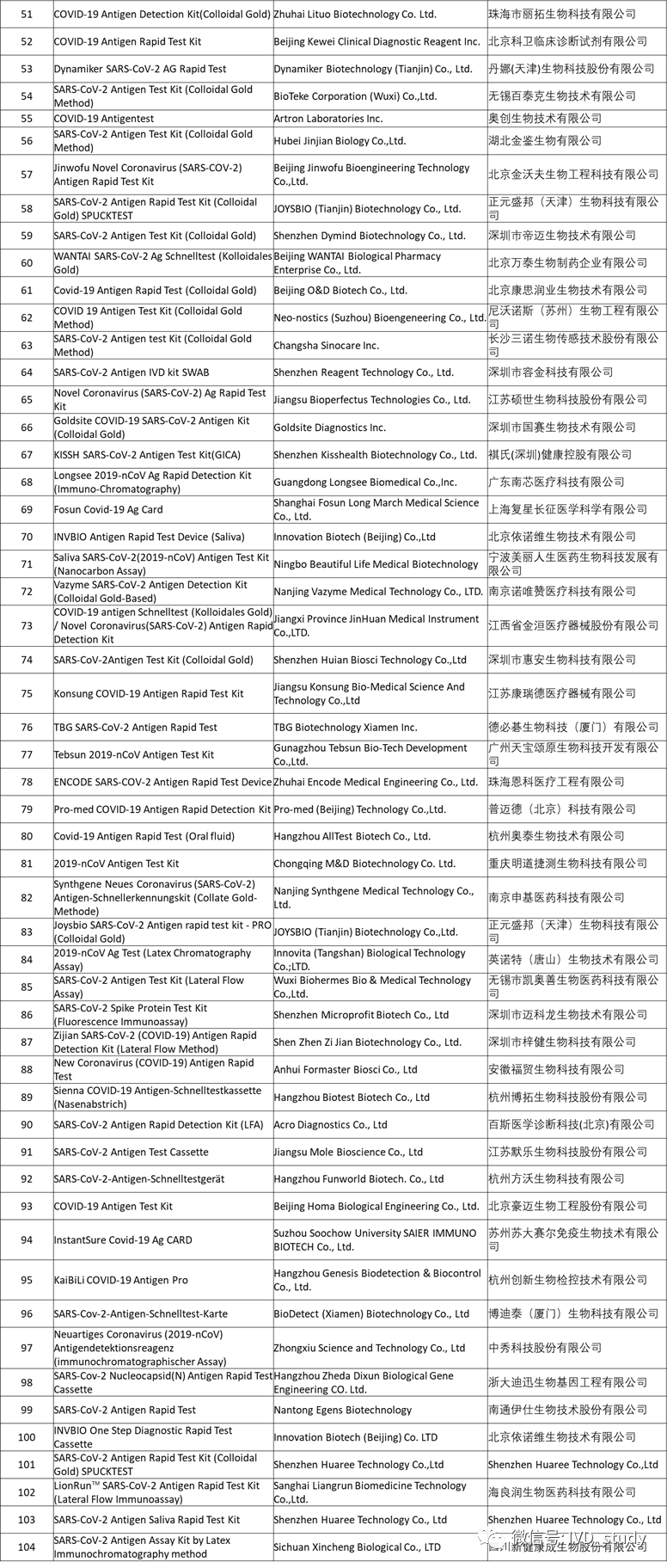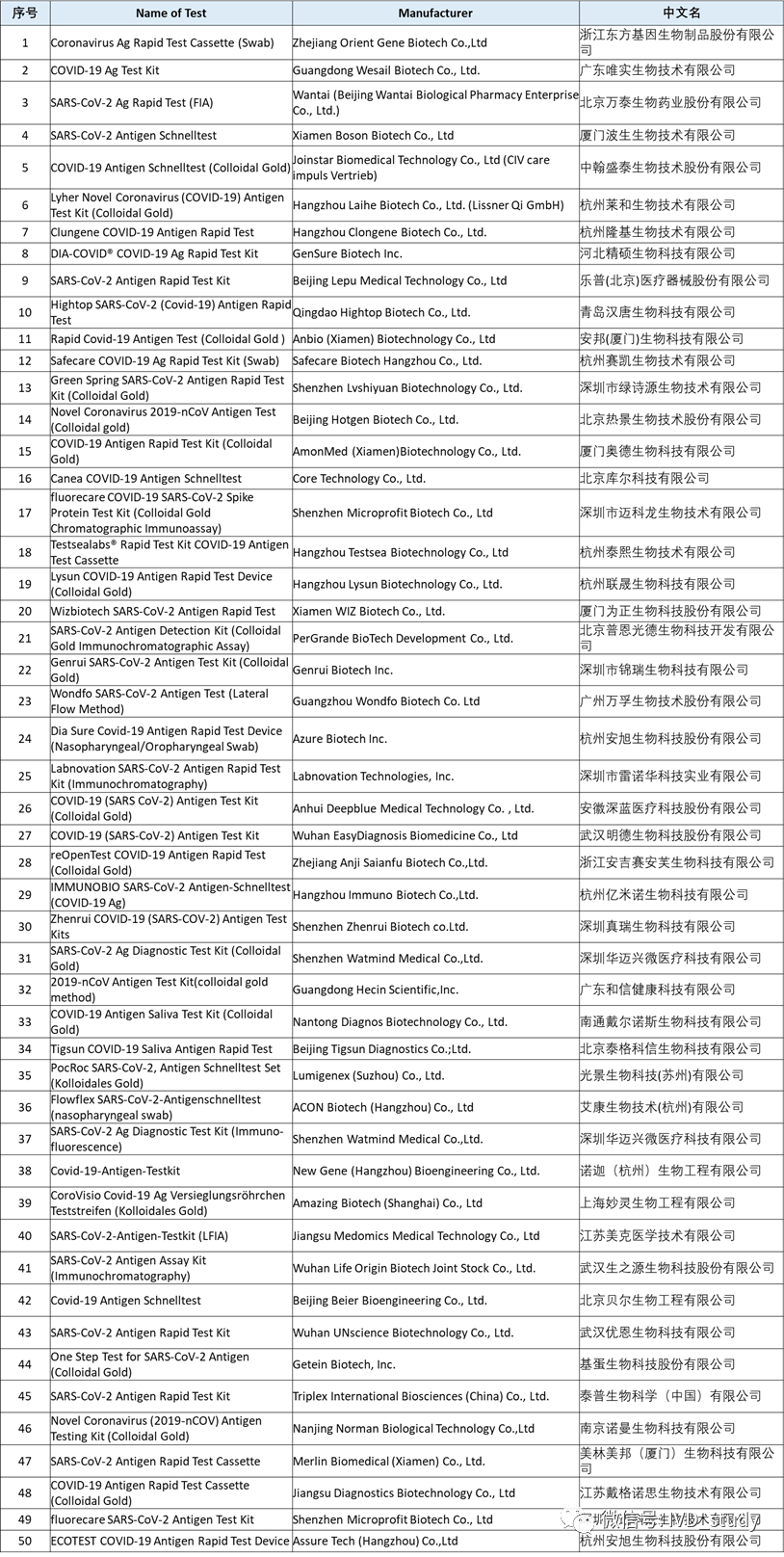 编者按: 1、这是对大量不同厂家和设计的SARS-CoV-2快速抗原检测试剂进行评估,此实验只能体现目前试剂灵敏度的情况,无法反应试剂的特异性。 2、以下列表列出截至目前已纳入评估并的POCT。经过测试后,不能通过测评最低要求的产品将从BfArM中删除。 3、随着评估的不断进行,表格也会相应进行修订。 4、此次清单中一种174个产品通过测评,包括104个中国产品,97家生产制造商。 5、一切请以PEI发布的官方英文名称为准。 测试设计和要求: 样本准备:3个浓度梯度 超高浓度——PCR CT值17-25 高浓度——PCR CT值25-30 中浓度——PCR CT值30-36 CT值和RNA拷贝换算比例: CT25 约10^6 RNA copies/ml, CT30约10^4 RNA copies/ml,CT36约10^3 RNA copies/ml. 灵敏度最低标准: 检测PCR CT值<25的样本符合率为75% 以下是9月7日,官方网站发布的最新清单,恭喜大家,海外新冠抗原检测市场依然大有可为!小伙伴们捋起袖子加油干! 原文链接:Liste der Antigen-Tests zur professionellen Anwendung zum direkten Erregernachweis des Coronavirus SARS-CoV-2 (bfarm.de) |