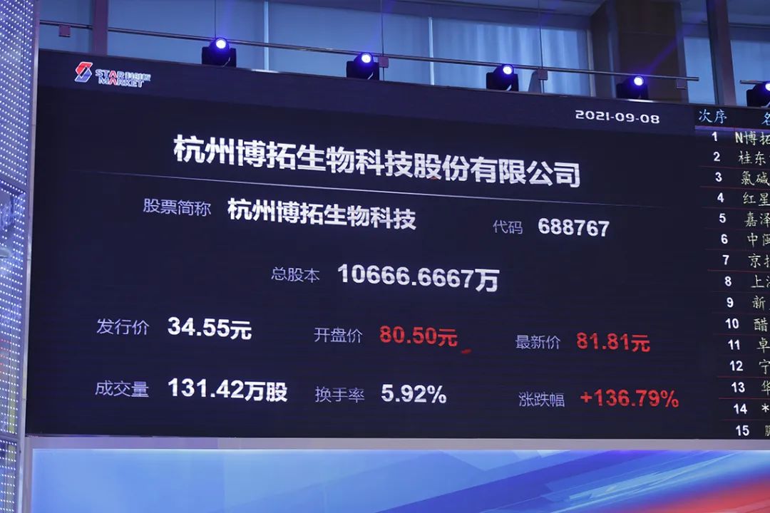 2021年9月8日,杭州博拓生物科技股份有限公司在上海证券交易所科创板上市。股票简称:杭州博拓生物科技,股票代码:688767 。发行价格为34.55元/股,开盘价80.50元/股。