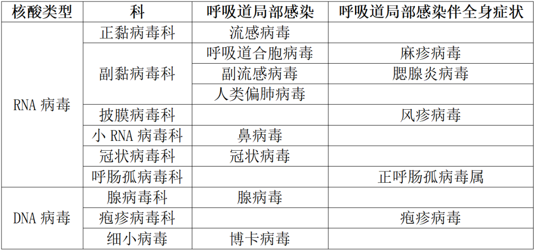 呼吸道是人体三大与外界连通的管道之一,外界众多病原体很容易进入呼吸道并引起多种疾病的发生。这些疾病具有易感性强、传播速度快、较难控制的特点。世界卫生组织在新冠疫情之前的数据显示,呼吸道感染及其引起的其他疾病排在人类死亡原因的第三位[1],而在疫情的当下,这个数据有可能更高。 呼吸道最为常见的感染是由病毒引起的。席卷全球的新型冠状病毒肺炎已经严重挑战了全球医疗体系,成为当下的呼吸道感染领域的绝对主角。因此我们讨论呼吸道感染的主题,主要就是分析呼吸道各种病毒。 呼吸道病毒中临床较为常见的有冠状病毒、流感病毒、合胞病毒、鼻病毒、副流感病毒、腺病毒等。根据核酸类型、科分类以及是否伴随全身症状可分类如下。 呼吸道局部感染更为常见,上述引起局部感染的这几类病毒也是90%以上的呼吸道传染疾病的病原。 主要侵犯呼吸道和消化道,可以累及神经系统。冠状病毒是呼吸道感染最主要的病原体,约占普通感冒的致病原的15%~30%[2]。近几十年来,引起全球性重大传染性疾病疫情也有一半以上和此类病毒相关,SARS、MERS、新冠肺炎疫情都是由此类病毒引发,每隔几年就有一个新发现的冠状病毒搅动全世界防疫的神经。 冠状病毒 严重急性呼吸系统综合征(SevereAcute Respiratory Syndrome),2003年暴发的由新型冠状病毒引起的一种呼吸道疾病,该疫情主要发生在东亚地区,历时一年造成8000多人感染,774人死亡。由于激素调节免疫方法的广泛使用降低了一定的病死率,但是10%左右的病死率还是在呼吸道病毒感染里居于高位。我国医疗体系也在2003年的SARS疫情获得经验和教训,为以后应对冠状病毒的疫情积累了丰富的经验。 中东呼吸系统综合征,2012年暴发在中东地区,也是由一种新型冠状病毒(MERS-CoV)引起的一类快速严重呼吸道症状,比起其他冠状病毒感染,发病更快,危重率更高,而且会迁延到泌尿系统,引起呼吸衰竭和肾衰竭双系统衰竭,所以对于有基础疾病的人群,病死率极高。到2015年9月,全球累计1569例,死亡703例,病死率45%[3],高居呼吸道病毒致死率首位。 目前广泛流传于全球的病毒感染性呼吸道疾病。是由一种新型冠状病毒(SARS-CoV-2)引起的,主要感染部位为下呼吸道、肺部。截至2021年8月13日,已经造成全球两亿人感染,430万死亡,病死率2.1%。从病死率看,低于SARS和MERS。但是传播率极高,传播范围极广,作为全球性疫情,可以在全球传染病历史上排到前5位,在呼吸道传染病领域,仅次于上世纪10年代的欧美流感大流行[4]。 此外,近年来研究人员还先后发现了三种其他的致病性冠状病毒:HCoV-NL63、HCoV-HKUI和HCoV-12,这三种冠状病毒同OC43和229E两个抗原型一样属于引起普通感冒的低致病性冠状病毒。至此,致病性冠状病毒一共有8种[5]。 包括人流感病毒和动物流感病毒。人流感病毒分为甲(A)、乙(B)、丙(C)三型,是流行性感冒(流感)的病原体。其中甲型流感病毒抗原性易发生变异,多次引起世界性大流行。 例如1918~1919年的大流行中,全世界至少有2000万~4000万人死于流感;乙型流感病毒对人类致病性也比较强,但是人们还没有发现乙型流感病毒引起过世界性大流行;丙型流感病毒只引起人类不明显的或轻微的上呼吸道感染,很少造成流行。 甲型流感病毒于1933年分离成功,乙型流感病毒于1940年获得,丙型流感病毒直到1949年才成功分离。在核蛋白抗原性的基础上,流感病毒还根据血凝素HA和神经氨酸酶NA的抗原性分为不同的亚型。 HA可分为18个亚型,NA分为11个亚型,两者不同组合形成不同的流感亚型,基因重组、抗原漂移、抗原转变造成了病毒变异,新的病毒毒株不断涌现是每年流感都会按照季节出现的主要原因。 流感病毒 甲型流感病毒(InfluenzaAvirus)是最常见、致病性最强的流感病毒,它不仅有众多的亚型,众多的变异株,还涵盖了禽流感及猪流感等人和动物共患病流感的毒株,因此,针对流感的流调、治疗、疫苗基本上都是针对甲流病毒的。 2009年,美国墨西哥暴发了席卷全球的H1N1甲流大流行,这场疫情的甲型H1N1在基因片段、HA抗原性和病毒进化来源上同以往的都有所差异,是猪流感、禽流感、人流感病毒基因重组产生的混合毒株,因此传染性和致病性大增,造成了全球范围的40多万的感染,死亡5000多人,病死率1.3%[6]。 除此之外,每年或者每一两年也都会有小规模的甲流流行,每年因流感死亡人数,中国是8-9万,美国是2-3万,其中大部分是甲流导至的死亡[7]。 乙型流感病毒(InfluenzaBvirus)引起的流行性感冒,具有起病快,传染性强的特点,症状和应对方案(检测、治疗、防控)与甲流相似,但是重症及病死率低于甲流,抗原转变的频率较甲流低,因此针对乙流的疫苗作用时间较甲流长。对于乙流病毒处置我们一般参照甲流病毒,将两者合并管理、诊治防控。 丙型流感病毒仅会引起轻微的上呼吸道症状,因此对其没有严格的管控措施和针对性治疗方案,仅仅是和鼻病毒、腺病毒等普通感冒病原一样的处理方案。 近年来,动物患流感正在突破种族屏障和受体特异性,不断变异为人和动物共患疾病。禽流感,病毒属于甲型流感病毒,但是原本只是主要感染禽类等低等脊椎动物,但是近年来,该病毒不断的变异,突破种族屏障,变异出了感染人的能力,并且不断的引发疫情。2013年,H7N9型的禽流感病毒在我国造成流行疫情。造成130多人感染,45人死亡的结果[2]。 包括合