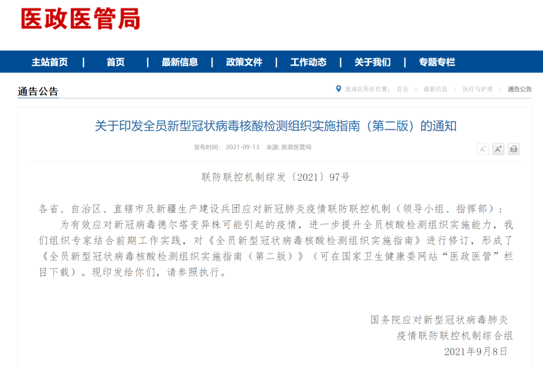 为有效应对新冠病毒德尔塔变异株可能引起的疫情,国家卫健委组织专家修订形成了《全员新型冠状病毒核酸检测组织实施指南(第二版)》。 单采检测阳性处置流程。 单采样本检测结果阳性时,检测机构应当立即上报核酸检测工作组,工作组同时推送2条信息(阳性感染者基本信息、核酸检测阳性报告)至6个部门。一是通知120负压救护车进行阳性感染者转运。二是通知定点医疗机构准备接收该阳性感染者。三是通知阳性感染者所在社区(小区)确认并控制该阳性感染者及与其共同生活居住人员(密接)。四是通知公安机关协助进行阳性感染者转运,并开展该阳性感染者轨迹排查。五是通知疾控中心开展流调、密接排查、研判社区封控范围、疫点终末消毒等工作。六是通知疫情防控指挥部。上述6个部门同时推送、不分先后。 混采检测阳性处置流程 各市成立应急采样小分队,24小时在岗待命,做好随时出发的各项准备。混采检测阳性时,检测机构立即上报当地核酸检测工作组,工作组同时通知应急采样小分队、混管样本所在社区(小区)和公安机关,立即原地隔离所涉人员并进行单采复核。采取首检负责制,单采复核样本送至原实验室进行检测。如单采复核结果阳性,参照单采检测阳性处置流程处理,混阳单采检测工作应在6小时内完成(详见下图)。 全员新型冠状病毒核酸检测 组织实施指南(第二版) 核酸检测是新型冠状病毒(以下简称新冠病毒)感染防控的重要手段。为指导各地做好大规模人群新冠病毒核酸检测各项准备工作,确保在规定时间内保质保量完成划定区域范围内全员核酸检测任务,实现“早发现、早隔离、早诊断、早治疗”,制定本指南。 一、总体要求 积极应对新冠肺炎疫情,快速高效管控疫情,规范全员核酸检测组织、采样、检测、报告等工作流程,统筹调配核酸检测资源,提高核酸检测质量。500万人口以内的城市,应当在2天内完成全员核酸检测任务,必要时可通过省(区、市)内统筹保障。500万人口以上的城市,应当在3天内完成全员核酸检测任务,必要时可申请全国支援。 二、组织实施 (一)党委政府负总责。各级党委政府对全员核酸检测工作负总责,统筹各级各相关部门,多方联动,扁平化管理。 (二)建立组织机制。要求设区市在当地联防联控机制下成立核酸检测工作组,由市委常委牵头,组织卫生健康、公安、民政、交通运输、财政、工业和信息化、宣传等相关部门,多方联动,建立扁平化工作机制,出现疫情时紧急启用,统筹协调核酸检测工作。以居民小区楼宇、自然村组、学校、机关事业单位、企业、公司、市场、宾馆等为最小单元,做到全覆盖、无遗漏。做好全员核酸检测物资的统一购买和统一调配。 (三)制定工作方案。市、县(市、区)制定具有可操作性的大规模核酸检测工作方案,平急结合,可适时开展预警式筛查演练。 (四)组建工作队伍。 1.组建各级核酸采样、样本运送、核酸检测、信息平台技术保障和相应的应急等队伍,明确采样和检测责任区域,全省任一地方启动全员核酸检测时,能立即投入开展工作。各应急队伍保证24小时在岗待命,做好随时出发的各项准备。 2.成立核酸采样督导组,采用分片包干的形式巡回指导各采样点,规范采样、个人防护和交叉感染防控等相关工作,及时发现问题、解决问题,保障采样高质高效。 3.成立核酸检测督导组,组织临床检验专家建立巡查蹲点督导机制,对各实验室开展巡查,对第三方核酸检测机构进行蹲点督导。 4.成立数据专班,核酸检测信息统一归口管理,确定核酸检测信息流转流程,专人收集、专人统计、专人上报,提高信息流转效率和准确性。 (五)统筹调配资源。建立省内核酸采样和检测片区支援机制,动态全面掌握各地各核酸检测机构基本情况和日(24小时)检测能力,根据全员核酸检测启动地的需求进行科学、合理调配。必要时向国务院联防联控机制申请支援。 (六)制定应急预案。各乡镇、社区组建工作专班,配足配齐工作人员,全面摸清、动态掌握网格全员底数,做好采样场所的合理规划和物资准备,明确采样点布局及人员配备等。制定应急预案,定期开展演练,保证一旦启动,能够迅速组织到位,有序开展现场采样。 三、工作准备 (一)摸清底数,建立台账。