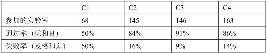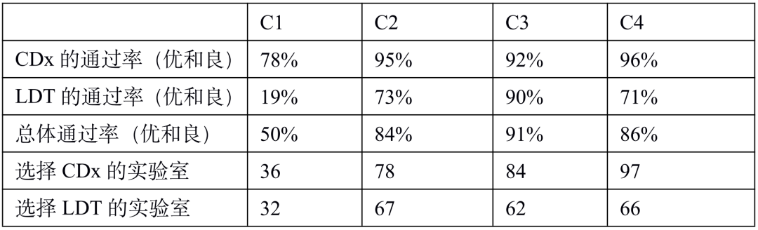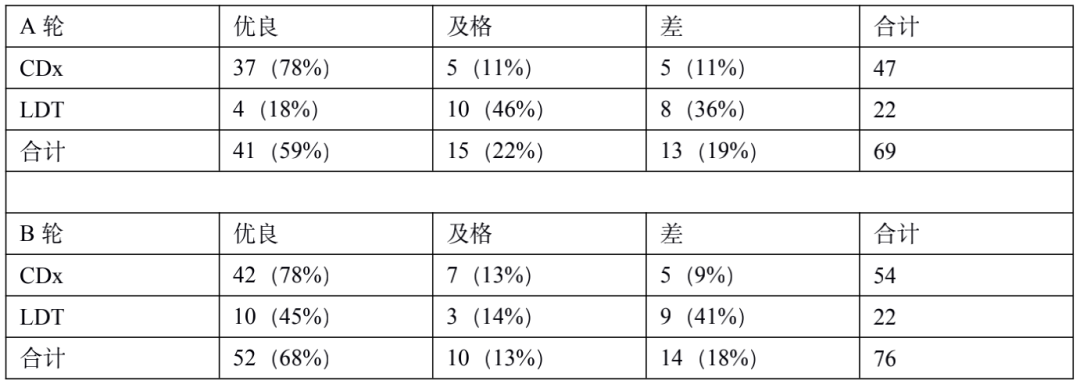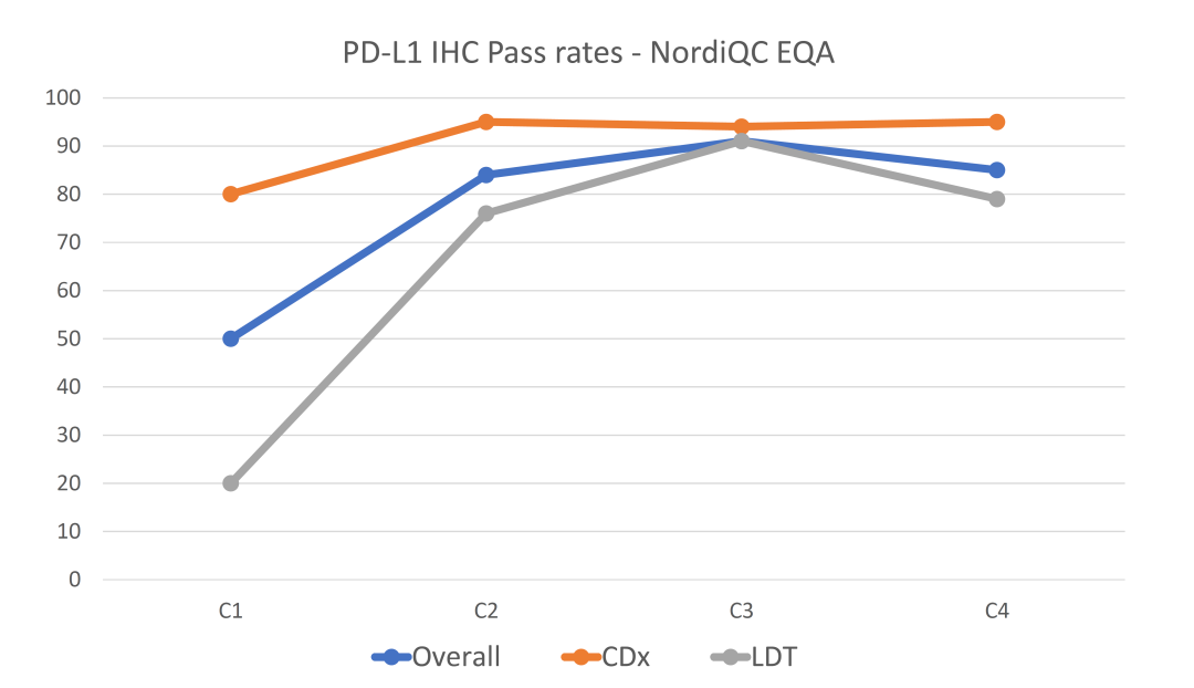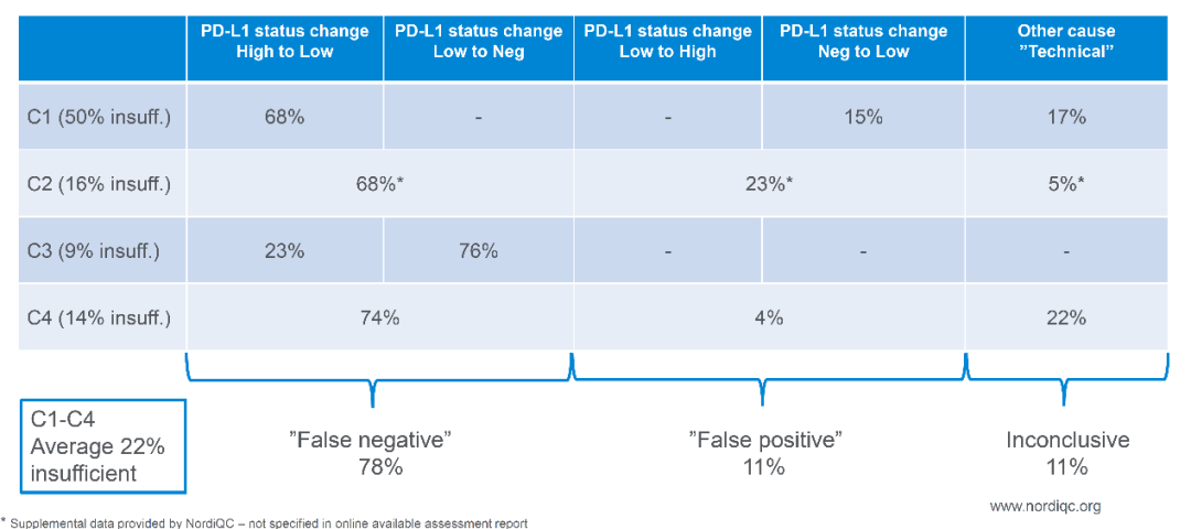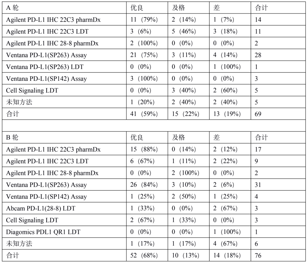 PD-L1 是肿瘤免疫治疗应用最广的生物标志物。由于不同 PD-1 药物和检测试剂的组合,目前 PD-L1 的检测和判读存在一定的挑战。自从 2019 年以来,已有 22C3, 28-8, SP263, SP142 等多款 PD-L1 检测试剂获批上市,分别伴随不同的 PD-1/PD-L1 治疗药物。这几款获批试剂的检测平台、染色程序、阅片方法、cutoff 值判定存在差异;此外不少医疗机构出于条件所限,选择实验室自己开发(LDT)的方式进行 PD-L1 检测,导至国内各医疗机构 PD-L1 检测质量参差不齐,亟需开展室间质评提升质量。PD-L1 检测的质评工作不限于抗体,而是对检测平台、抗体克隆号、染色程序、封闭/开放检测、阅片方式等整个检测系统的质量进行评估。他山之石可以攻玉,NordiQC(Nordic Quality Control)和NEQS(National External Quality Service)开展的国际多中心室间质评为我们提供了宝贵的经验借鉴。北欧 NordiQC 免疫组化质控中心是国际权威的病理室间质评机构,一直致力于推进免疫组化流程的标准化和实验条件的优化。NordiQC 对 PD-L1 用于非小细胞肺癌(NSCLC)的室间质评已趋于成熟,采用统一的组织芯片(TMA)作为室间质评材料、肿瘤比例评分(TPS)作为统一的阅片方法、统一的染色评价标准。NodiQC 的室间质控能够对 PD-L1 整个检测体系都进行质量评价,受到越来越多实验室的欢迎和参与,参与实验室从第 1 次的 63 家增长到第 4 次的 163 家。NordiQC 用于室间质评的 TMA 由三部分构成,分别是细胞系质控、质控组织、NSCLC组织,详见表 1。考虑到临床样本可能出现的不同状况,待评估NSCLC组织包含了 PD-L1 不同的表达水平,大体分为不表达(<1%)、低表达(1-49%)、高表达(≥50%)。表1. NordiQC 用于 PD-L1 室间质评的 TMA 组成* TPS 评分参考数据由 NordiQC 参考实验室采用 Agilent PD-L1 IHC 22C3 pharmDx 和 Agilent PD-L1 IHC 28-8 pharmDx 检测后确定。NordiQC 按照统一的评估标准,将 PD-L1 染色结果评为优(optimal)、良(Good)、及格(borderline)、差(poor)。以下为具体标准介绍。染色评估为优的评估标准包括:染色在所有纳入的组织中被认为是完美的或接近完美, NSCLC 样本的 TPS 评分与 NordiQC 参考数据一致。染色评估为良的评估标准包括:染色在所有纳入的组织中被认为是可接受的,但可以优化染色方案至最佳染色强度、对比度、形态学和信噪比,NSCLC 样本的 TPS 评分与 NordiQC 参考数据一致。染色评估为及格的评估标准包括:染色被认为是不充分的,例如整体染色太弱,纳入的组织出现假阴性染色或假阳性染色,染色方案需要优化,NSCLC 样本的 TPS 评分与 NordiQC 参考数据不一致。染色评估为差的评估标准包括:染色被认为极其不充分,例如出现大面积假阴性染色或假阳性染色,染色方案亟需优化,NSCLC 样本的 TPS 评分与 NordiQC 参考数据不一致。我们将染色评估为优和良的结果合并为染色通过(sufficient),及格和差的结果合并为染色失败(insufficient),计算获得 4 轮室间质评的通过率。从 C1 到 C3,参加实验室增加了一倍,通过率显著提高。从 C3 到 C4,参加的实验室从 146 增长至 163,通过的实验室数量保持稳定(133 增长至 140),通过率由 91% 微降至 86%。4 轮室间质评通过率的结果详见表 2。从 4 轮室间质评染色失败(insufficient)的情况来看,平均失败率为 22%。我们对这些未能通过的染色结果进行了原因分析,详见图1。染色失败的情况既出现在 PD-L1 结果与参考数据不一致,也出现在染色过程中的技术问题。未能通过的原因可分为:1)假阴性结果,最主要原因,占全部原因 78%;2)假阳性结果,占全部原因 11%;3)其他原因,信噪比太差以及其他染色技术问题,占全部原因 11%。表 2. 参与 4 轮 NordiQC 室间质评的通过率我们又进一步分析了参与 4 轮室间质评国际多中心实验室的检测体系,按照 PD-L1 检测试剂是否为 CE-IVD/FDA 审批试剂,是否完全按照厂家的封闭系统进行操作,分为 CDx 和 LDT 两大类。其中 CDx 需要同时满足 CE-IVD/FDA 审批的 PD-L1 试剂以及完全用于厂家封闭系统,未获批的 PD-L1 试剂或者用于开放系统都属于 LDT。我们发现 CDx 和LDT的通过率存在较大差异。选择 CDx 实验室,PD-L1 质评通过率很高,从 C2 到 C4 稳定保持在 95% 左右,批间差较小;选择 LDT 实验室,其 PD-L1 通过率较低,且上下波动较大(70%~90%),不利于稳定开展。从实验室的选择来看,选择 CDx 的实验室从 C1 到 C4 稳步增加到 97 家,而选择 LDT 的实验室数目从 C2 到 C4 基本维持在 65 家左右,选择 LDT 与 CDx 的实验室差距越来越大。详细结果参见表 3. CDx 与 LDT 的通过率比较。UK NEQAS 也是国际权威的病理质控机构,侧重于免疫组化和原位杂交的外部质量保证(EQA),NEQAS 对常见的 PD-L1 检测试剂(Agilent PD-L1 IHC 22C3 pharmDx,Agilent PD-L1 IHC 28-8 pharmDx, Ventana PD-L1(SP263) Assay, Ventana PD-L1 (SP142) Assay, Abcam PD-L1等)用于非小细胞肺癌(NSCLC)的外部质量保证评价。采用 FF PE 样本进行了三轮 EQA(预实验,A轮和B轮)。待评估的样本包含细胞系、扁桃体组织,NSCLC 组织,以及参与实验室自制的内部质控。样品组包括一系列 PD-L1 抗体表位浓度,包括接近临界值的“关键样本”。由 4 人组成的专家小组在多头显微镜上独立地评估所有返回的载玻片,包括参与实验室的内部质控。除了扁桃体样本被评估为“可接受”或“不可接受”,对于其他样本,PD-L1 染色的肿瘤细胞百分比按预定类别进行评估(<1%、1 至 <5%、5 至 <10%、 10 到 <25%、25 到 <50%、50 到 <80%、80 到 100%)。在预实验和随后的两次运行中,参与实验