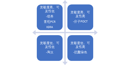 3.分子诊断新产品 PCR方法检测结核分枝杆菌由来已久,包括荧光定量PCR和等温扩增方法,也发展出不少POCT分子诊断方法。 荧光定量PCR主要有赛沛的Xpert MTB/RIF系列产品,罗氏的Cobas TaqMan MTB产品,雅培的RealTime MTB和MTBRIF/INF产品,Hain公司的Genotype MTBDRplus、Genotype MTBDRsl、Fluoro TypeMTBDR产品,BD公司的MAX-MDR-TB产品,厦门致善公司的MeltPro-TB产品等。 赛沛新一代结核检测产品包括Xpert MTB/RIF Ultra、Xpert MTB/XDR,基于原XpertMTB/RIF产品的系统和方法学,不同的是Ultra的灵敏度更高,检测时间更短。XDR则可以检测包括异烟肼、氟喹诺酮类等在内的多重耐药,被定位为MTB/RIF或Ultra检测到利福平耐药患者的附加检测。 Ultra和XDR在国外已获得批准用于临床检测,获得了WHO的推荐,提高了结核分枝杆菌的检测灵敏度,特别是在检测脑脊液、胸水等标本中的结核分枝杆菌时取得了非常好的效果。 等温扩增方法 日本荣研株式会社TB-LAMP产品是利用环介导等温扩增技术,快速、高效、特异性检测结核分枝杆菌复合群新型分子诊断产品。 世界卫生组织推荐TB-LAMP或许可替代显微镜检查(有条件推荐),以帮助诊断有结核病症状和体征的成人肺结核。 对于有肺结核症状和体征的成人,特别是痰涂片阴性标本需要进一步检测时,或许也可考虑作为显微镜检查的后续检查。但TB-LAMP不能代替快速分子试验来检测TB和利福平耐药,尤其是MDR-TB高危人群。 除此以外,核酸质谱技术检测结核分枝杆菌对抗结核药物的耐药性也将会得到很好的应用,特别是基于纯培养的全基因组测序技术在结核分枝杆菌分子药敏的检测方面更加具有非常好的临床应用价值,前景广阔。