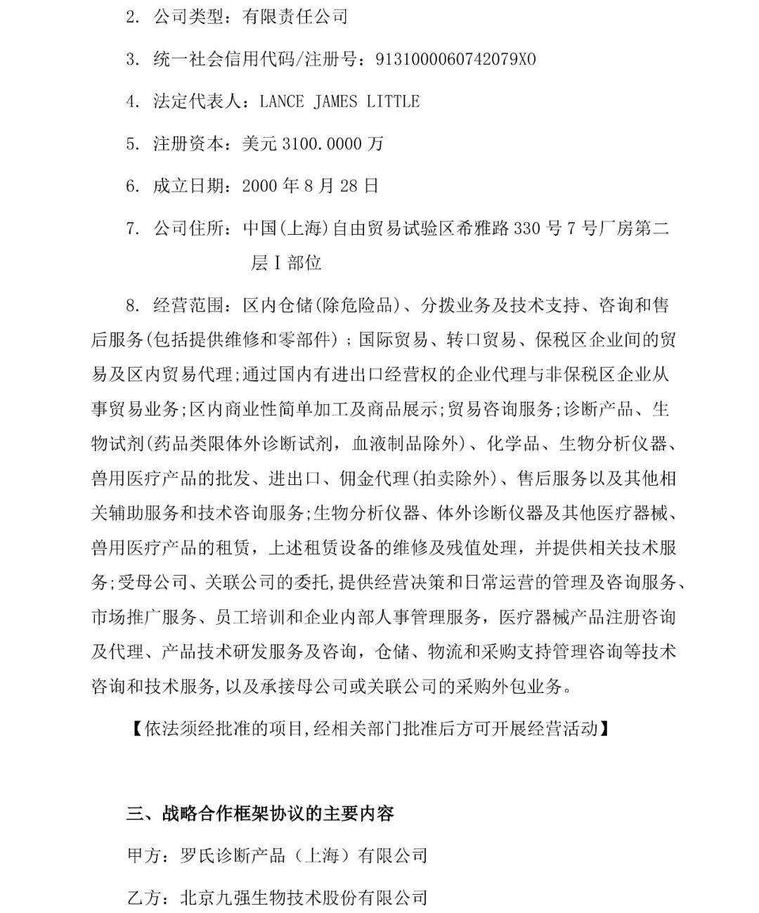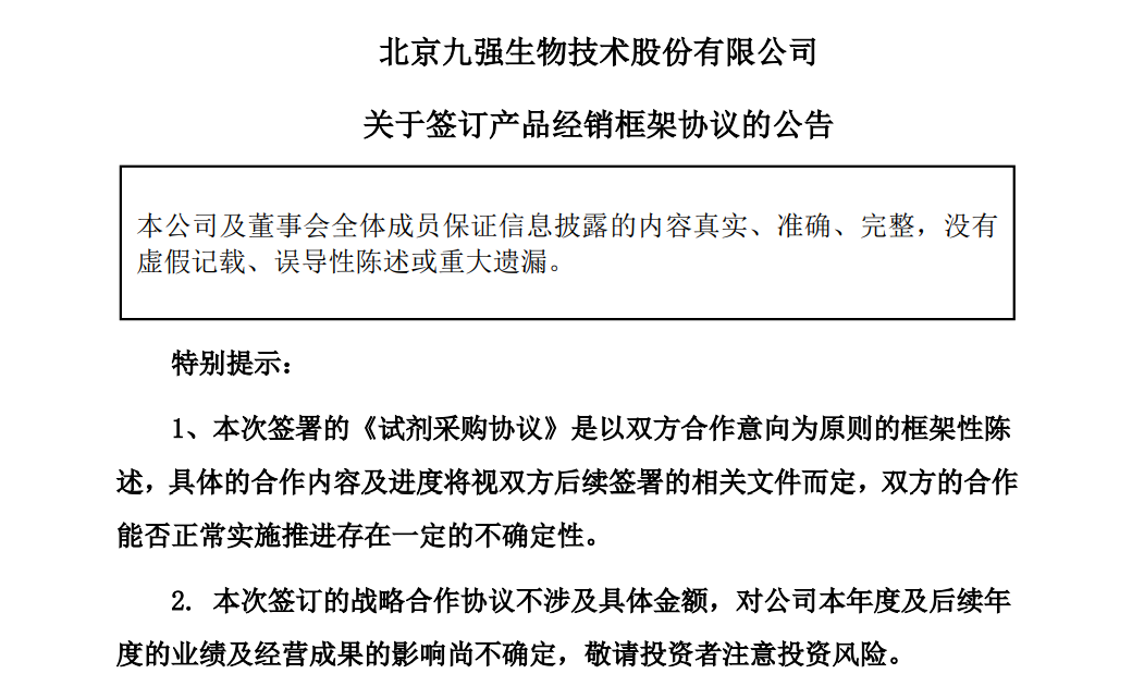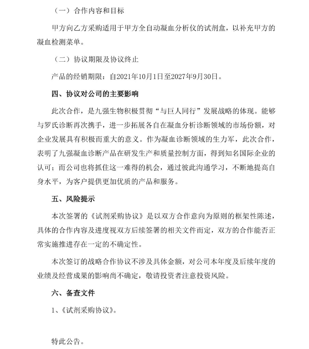 摘要: 九强生物(300406)9月21日晚间公告,公司与罗氏诊断产品(上海)有限公司签署《试剂采购协议》。公告称,罗氏诊断向九强生物采购适用于罗氏诊断全自动凝血分析仪的试剂盒,以补充罗氏诊断的凝血检测菜单。产品的经销期 ...