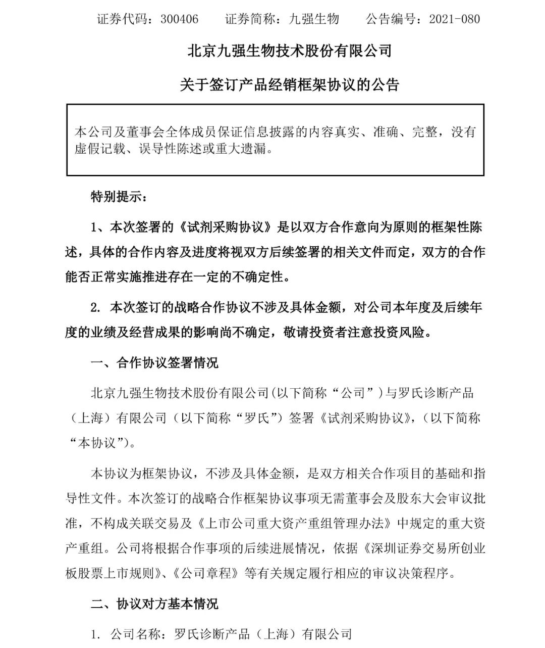 九强生物(300406)9月21日晚间公告,公司与罗氏诊断产品(上海)有限公司签署《试剂采购协议》。