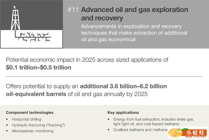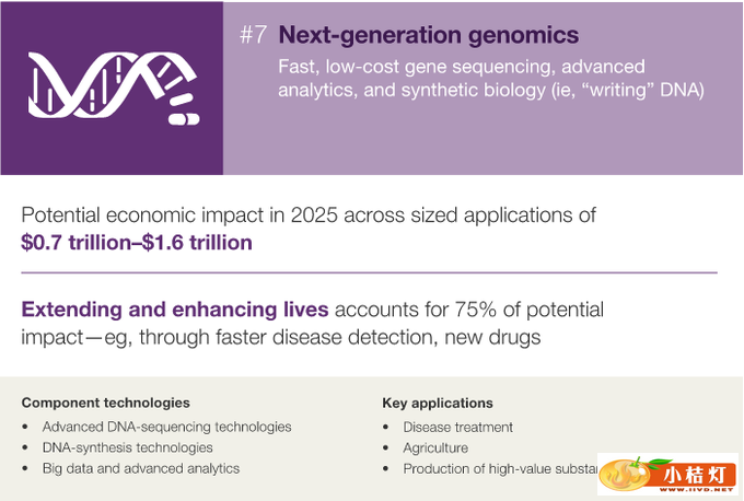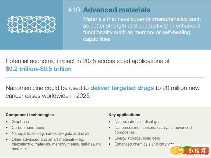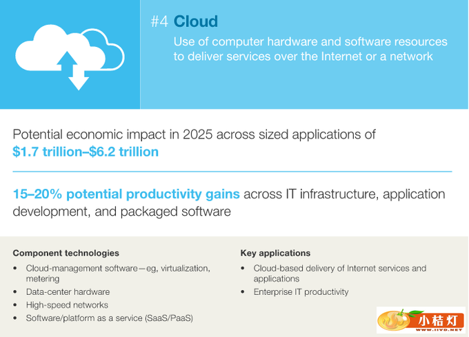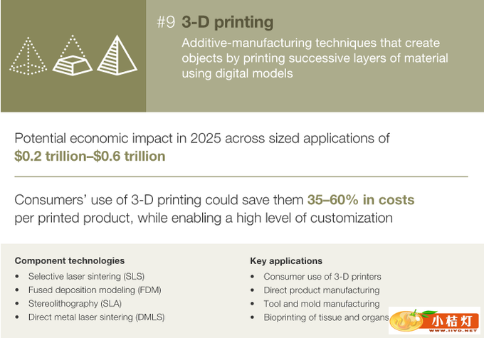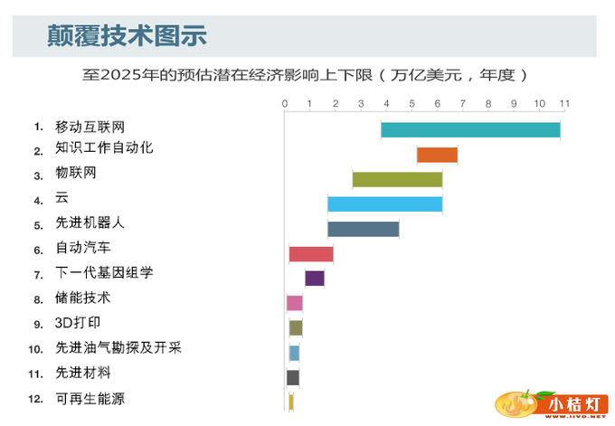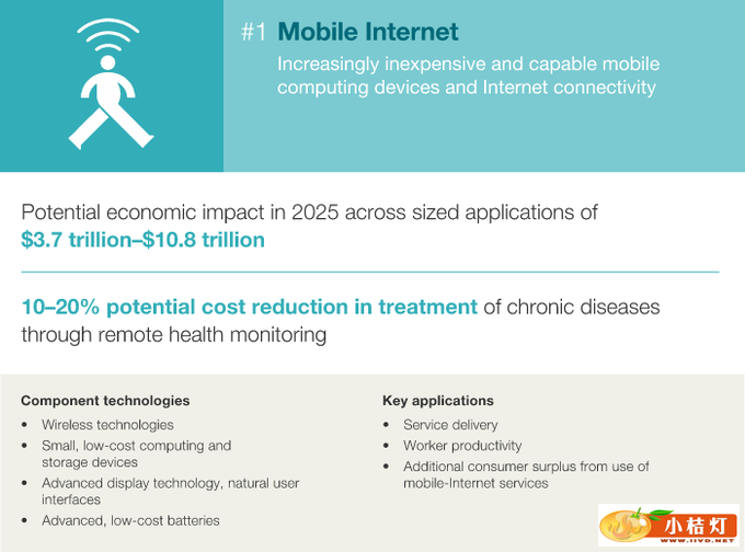 | 麦肯锡发布了一项报告,里面研究了技术对未来经济影响程度。研究的对象是一些正在取得飞速发展、具有宽泛影响,且对经济影响显著的技术。相反,那些过于遥远的,仅能影响 1、2 个行业的,以及 2025 年之前不大可能实用化的技术(如混合动力),或者是虽然即将成熟但不够大众化的技术(如私人太空飞行)等则不在考虑范围内。 以下就是麦肯锡列举的颠覆性技术及其潜在的经济影响程度(含消费者盈余在内,即消费者并未支付的因创新而获得的价值),当然,这种影响评估只是粗略的,不会像 GDP 数字那么具体。 ![]() ✪ 下图数字更具体一点: ![]() 如上表所示,麦肯锡认为,未来 10 多年最具经济影响性的技术应该是那些已经取得良好进展的技术—如已经在发达国家普及并在新兴国家蓬勃发展的移动互联网;知识工作的自动化,比方说用计算机语音来处理大部分的客户电话;物联网,比方说将传感器嵌入物理实体中用来监控产品在工厂的流动;以及云计算。按照麦肯锡的估算,到 2025 年,这些技术每一个对全球经济的价值贡献均超过 1 万亿美元(即便是预测的下限)。 不过麦肯锡的报告中令人感兴趣的预测是,一些比较性感的新潮技术,如无人驾驶汽车、3D 打印、可再生能源等的经济影响相对较低。 这种炒作热度(关于技术炒作可参见Garnter的技术炒作周期)与潜在经济影响力的失联可以从下图(纵向坐标为炒作指数,以过去 1 年发表的效果技术文章数衡量;横向坐标为潜在经济影响)看出。经济影响力最大的技术并非炒作最厉害的。在图中,只有右上角的技术—移动互联网是名符其实的,即炒作与经济影响力相当。而相对而言,知识工作自动化、物联网、云计算以及先进机器人技术就要低调许多。 ![]() ✪ 以下就是这 12 项技术的关键摘要: 1、移动互联网 ![]() 价格不断下降能力不断增强的移动计算设备和互联网连接 ✪ 到 2025 年的影响力: 经济:3.7—10.8 万亿美元 生活:远程健康监视可令治疗成本下降 20% ✪ 主要技术包括: 无线技术 小型、低成本计算及存储设备 先进显示技术 自然人机接口 先进、廉价的电池 ✪关键应用包括: 服务交付 员工生产力提升 移动互联网设备使用带来的额外消费者盈余 2、知识工作自动化 ![]() 可执行知识工作任务的智能软件系统 ✪ 到 2025 年的影响力: 经济:5.2—6.7 万亿美元 生活:相当于增加 1.1—1.4 亿全职劳动力 ✪ 主要技术包括: 人工智能、机器学习 自然人机接口 大数据 ✪ 关键应用包括: 教育行业的智能学习 医疗保健的诊断与药物发现 法律领域的合同 / 专利查找发现 金融领域的投资与会计 3、物联网 ![]() 用于数据采集、监控、决策制定及流程优化的廉价传感器网络 ✪ 到 2025 年的影响力: 经济:2.7—6.2 万亿美元,对制造、医保、采矿运营成本的节省最高可达 36 万亿美元 ✪ 主要技术包括: 先进、低价的传感器 无线及近场通讯设备(如 RFID) 先进显示技术 自然人机接口 先进、廉价的电池 ✪ 关键应用包括: 流程优化(尤其在制造业与物流业) 自然资源的有效利用(智能水表、智能电表) 远程医疗服务、传感器增强型商业模式 4、云 ![]() 利用计算机软硬件资源通过互联网或网络提供服务 ✪ 到 2025 年的影响力: 经济:1.7—6.2 万亿美元 ,可令生产力提高 15-20% ✪ 主要技术包括: 云管理软件(如虚拟化、计量装置) 数据中心硬件 高速网络 软件 / 平台即服务(SaaS、PaaS) ✪ 关键应用包括: 基于云的互联网应用及服务交付 企业 IT 生产力 5、先进机器人 ![]() 具备增强传感器、机敏性与智能的机器人;用于自动执行任务 ✪到 2025 年的影响力: 经济:1.7—4.5 万亿美元 生活:可改善 5000 万截肢及行动不便者的生活 ✪主要技术包括: 无线技术 人工智能 / 计算机视觉 先进机器人机敏性、传感器 分布式机器人 机器人式外骨骼 ✪ 关键应用包括: 产业 / 制造机器人 服务性机器人—食物准备、清洁、维护 机器人调查 人类机能增进(如钢铁侠) 个人及家庭机器人—清洁、草坪护理 6、自动汽车 ![]() 在许多情况下可自动或半自动导航及行驶的汽车 ✪ 2025 年的影响力: 经济:0.2—1.9 万亿美元 生活:每年可挽回 3-15 万个生命 ✪ 主要技术包括: 人工智能、计算机视觉 先进传感器,如雷达、激光雷达、GPS 机器对机器的通信 ✪ 关键应用包括: 自动汽车及货车 7、下一代基因组 ![]() 快速低成本的基因组排序,先进的分析,合成生物学(如”写“DNA) ✪ 到 2025 年的影响力: 经济:0.7—1.6 万亿美元 生活:通过快速疾病诊断、新药物等延长及改善 75% 的生命 ✪ 主要技术包括: 先进 DNA 序列技术 DNA 综合技术 大数据及先进分析 ✪ 应用包括: 疾病治疗 农业 高价值物质的生产 8、储能技术 ![]() 存储能量供今后使用的设备或物理系统 ✪ 到 2025 年的影响力: 经济:0.1—0.6 万亿美元 ,到 2025 年 40%-100% 的新汽车是电动或混合动力的 ✪ 主要技术包括: 电池技术—锂电、燃料电池 机械技术—液压泵、燃气增压 先进材料、纳米材料 ✪ 关键应用包括: 电动车、混合动力车 分布式能源 公用规模级蓄电 9、3D打印 ![]() 利用数字化模型将材料一层层打印出来创建物体的累积制造技术 ✪ 到 2025 年的影响力: 经济:0.2—0.6 万亿美元 生活:打印的产品可节省成本 35-60%,同时可实现高度的定制化 ✪ 主要技术包括: 选择性激光烧结 熔融沉积造型 立体平版印刷 直接金属激光烧结 ✪ 关键应用包括: 