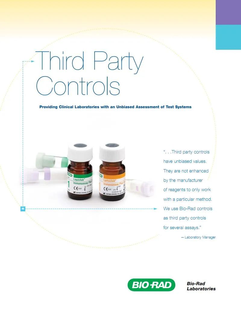 独立的第三方质控品 Control materials made by a third partythat has no relationship to the measurement procedure manufacturer or to thecalibrator, sometimes referred to as third party controls, are developedindependently without any influence from the instrument or reagentmanufacturer. 在CLSI C24第四版中,对于独立的第三方质控品,非常强调其与检测系统或者标准品的没有任何联系。并且第三方质控品生产商必须保证真正的生产自立,不受任何仪器或者试剂厂商的影响。