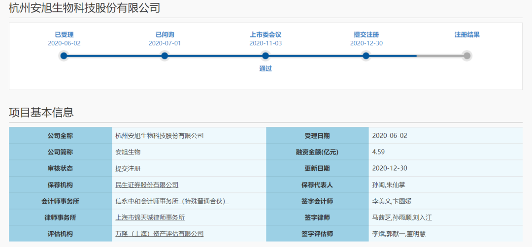 2021年9月28日晚间,证监会发布消息,同意杭州安旭生物科技股份有限公司科创板IPO注册。 主要财务指标: 安旭生物成立于 2008 年,专注于 POCT 试剂及仪器的研发、生产与销售,拥有 抗原抗体自主研发生产的生物原料技术平台,以及成熟的免疫层析及干式生化诊 断技术平台,发展形成了覆盖毒品检测、传染病检测、慢性病检测、妊娠检测、 肿瘤检测、心肌检测、生化检测、过敏原检测等八大领域的 POCT 试剂,产品远 销美国、德国、英国、加拿大、俄罗斯、墨西哥、泰国、印尼及波兰等多个国家, 已成为国内少数几家在 POCT 国际市场能够与跨国体外诊断行业巨头竞争的中国体外诊断产品供应商之一。 公司在发展过程中非常重视技术创新和产品升级,并实现了大量研发成果的转化。2013 年 12 月,公司被浙江省科学技术厅认定为“浙江省科技型中小企业”;2015 年 7 月,公司研发中心被杭州市科学技术委员会评为“杭州市企业高新技 术研究开发中心”;2015 年 9 月,公司被认定为“国家高新技术企业”;2016 年 12 月,公司研发中心被浙江省科学技术厅评为“省级高新技术企业研究开发中心”。