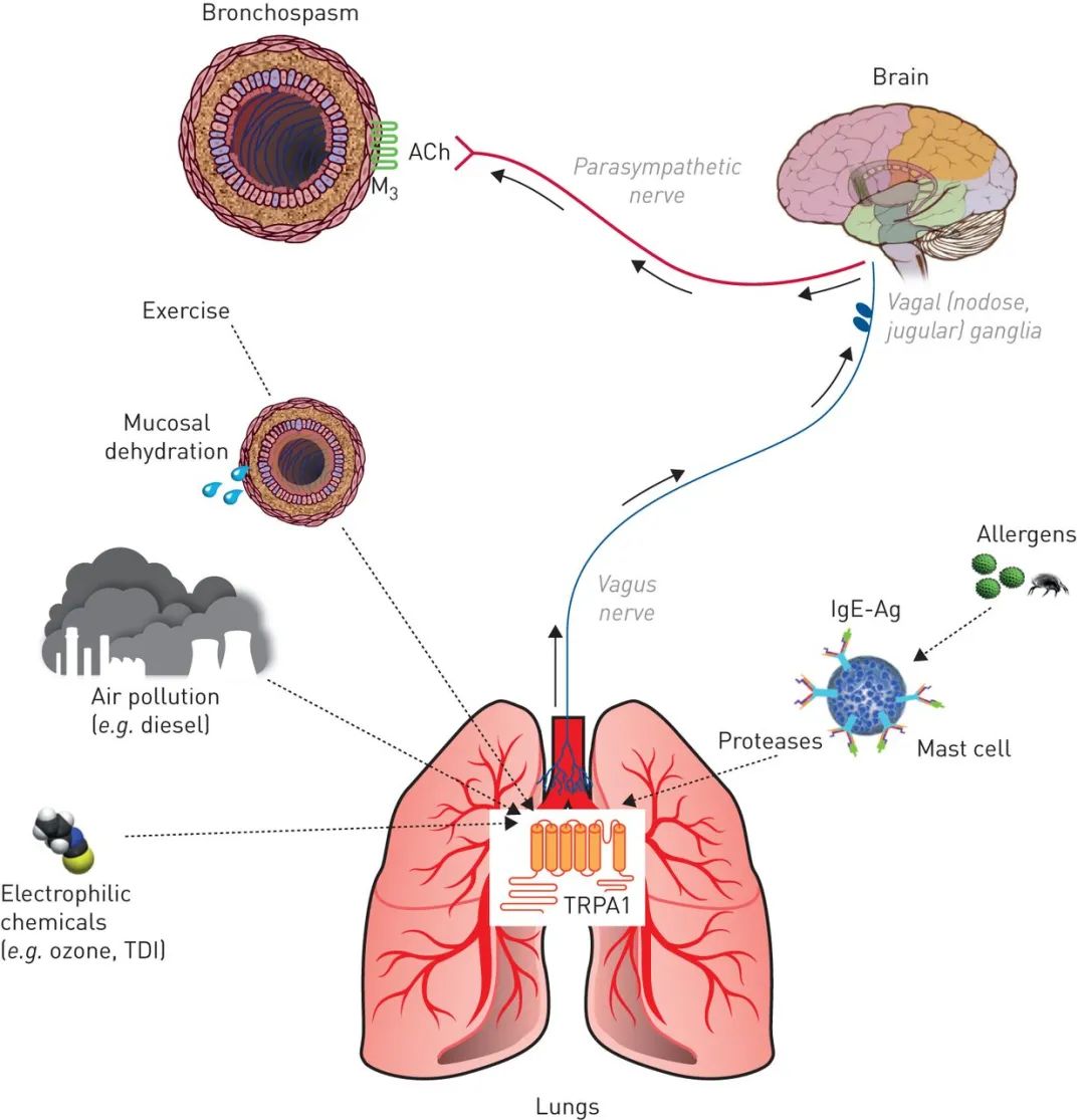 上边说了很多缓解慢性疼痛的应用,可能不大有人想到,这些受体还能用于治疗呼吸系统疾病。背后的原因其实不难理解:平时不小心吸入一些辣椒素,总是会让人咳嗽,这正是因为激活了TRPV1。为此,针对TRPV1开发药物,就可能缓解哮喘、慢阻肺病等呼吸道疾病引起的咳嗽现象。然而在临床试验中,TRPV1拮抗剂SB-705498能统计显著地抑制由辣椒素引起的咳嗽,但对慢性特发性咳嗽患者的自发咳嗽无缓解作用。其它研究中,另一种TRPV1拮抗剂XEN-D0501同样无法缓解复发性咳嗽患者的自发咳嗽。本综述的作者认为这说明针对这些特定的适应症,TRPV1拮抗剂可能效果不佳。但针对其它呼吸道疾病,它依旧有起效的希望。作者在综述中提到了哮喘——TRPV1在哮喘中的作用还具有一定争议性,比如一些研究表明抑制TRPV1具有效果,可以改善动物模型的症状,减少细胞炎症。但另一些分析表明不少结果都未能达到统计显著。这些结果为何并不统一?也有观点认为需要考虑物种的差异性。