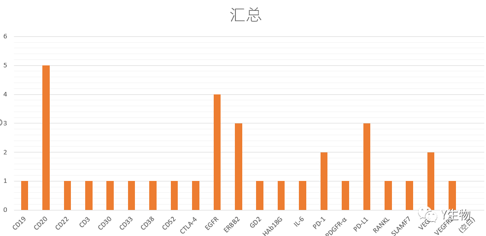 图1 横坐标为抗体药物的靶基因或蛋白,纵坐标为抗体药物的数目。