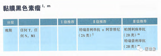 非上皮型:纳武利尤单抗+伊匹木单抗(1A类证据)为一线治疗I级推荐 上皮型:纳武利尤单抗+伊匹木单抗(2A类证据)为一线治疗II级推荐 度伐利优单抗联合培美曲塞+顺铂(3类证据)为一线治疗III级推荐 纳武利尤单抗(3类证据)为二线治疗III级推荐 纳武利尤单抗+伊匹木单抗(3类证据)为二线治疗III级推荐 度伐利优单抗+Tremelimumab (3类证据)为二线治疗III级推荐