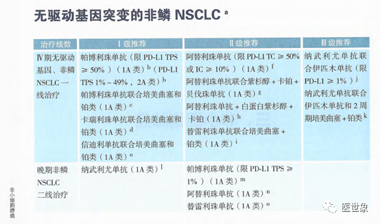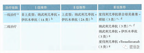 一线治疗III级推荐 纳武利尤单抗联合依匹木单抗(限PD-L1≥1) 纳武利尤单抗联合依匹木单抗和2周期培美曲塞+铂类