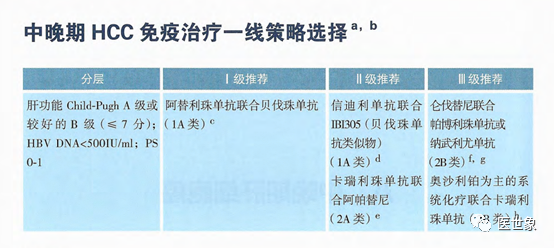 肝功能 Child-Pugh A级或较好的B级(≤7);HBV DNA <500IU/ml;PS 0-1; 阿替利珠单抗联合贝伐珠单抗(1A 类证据)为I级推荐。 信迪利单抗联合贝伐珠单抗类似物(1A 类证据)为II级推荐。 卡瑞利珠单抗联合阿帕替尼(2A类证据)为II级推荐。 仑伐替尼联合帕博利珠单抗或纳武利尤单抗(2B类证据)为III级推荐。 奥沙利铂为主的系统化疗联合卡瑞利珠单抗(2B类证据)为III级推荐。