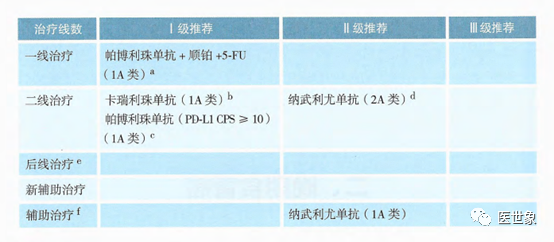 一线治疗 纳武利尤单抗联合化疗(1A类证据,PD-L1 CPS≥5)为一线治疗I级推荐。 帕博利珠单抗(2A 类证据,MSI-H)为一线治疗II级推荐。 帕博利珠单抗(IB 类证据,HER2阴性,PD-L1CPS≥ 1为一线治疗III级推荐;