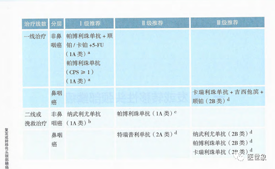 帕博利珠单抗+顺铂/卡铂+5-FU(1A类证据)、帕博利珠单抗(CPS≥ 1)(1A类证据)为非鼻咽癌一线治疗I级推荐。 纳武利尤单抗(1A类证据)为非鼻咽癌二线或挽救治疗I级推荐。 帕博利珠单抗(1A类证据)为非鼻咽癌二线或挽救治疗II级推荐。 卡瑞利珠单抗+吉西他滨+顺铂(2B类证据)为鼻咽癌一线治疗III级推荐。 特瑞普利单抗(2A 类证据)为鼻咽癌二线或挽救治疗II级推荐。 纳武利尤单抗(2B类证据)、帕博利珠单抗(2B类证据)、卡瑞利珠单抗(2B类证据)为鼻咽癌二线或挽救治疗II级推荐。