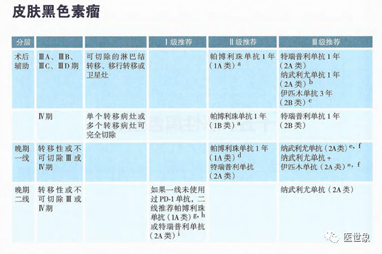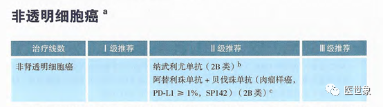帕博利珠单抗+阿昔替尼(1A 类证据)和 阿替利珠单抗+贝伐珠单抗(1A 类证据)为一线治疗(低风险组)的II级推荐。 Avelumab + 阿昔替尼(1A 类证据)和 纳武利尤单抗+卡博替尼(1B类证据)为一线治疗(低风险组)的III级推荐。 帕博利珠单抗+阿昔替尼(1A 类证据),阿替利珠单抗+贝伐珠单抗(1A 类证据),纳武利尤单抗+伊匹木单抗(1A类证据)为一线治疗(中、高风险组)的I级推荐。 Avelumab + 阿昔替尼(1A 类证据),纳武利尤单抗+卡博替尼(1B类证据)为一线治疗(中、高风险组)的III级推荐。 纳武利尤单抗(1A 类证据)为二线及以上治疗I级推荐。 帕博利珠单抗+阿昔替尼(2B类证据),纳武利尤单抗+伊匹木单抗(1A类证据)为二线及以上治疗II级推荐。 Avelumab + 阿昔替尼(3 类证据)为二线及以上治疗III级推荐。