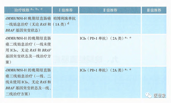 帕博利珠单抗(1A类证据)为dMMR/MSI-H晚期结直肠癌一线姑息治疗(无论RAS和BRAF基因突变状态)的I级推荐; dMMR/MSI-H的晚期结直肠癌二线姑息治疗(一线未使用ICIs,无论RAS和BRAF基因突变状态及一线治疗方案)、dMMR/MSI-H的晚期结直肠癌三线姑息治疗(一线、二线未使用ICIs,无论RAS和BRAF基因突变状态及一线、二线治疗方案)的II级推荐均为ICIs(PD-1单抗)(2A类证据)。