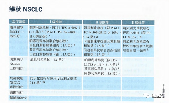 I级推荐 帕博利珠单抗(PD-L1 TPS≥50%,1A类证据)(PD-L1 TPS 1%-49%,2A类证据) 帕博利珠单抗联合紫杉醇/白蛋白紫杉醇和铂类(1A类证据) 替雷利珠单抗联合紫杉醇/白蛋白紫杉醇和卡铂(1A类证据)
