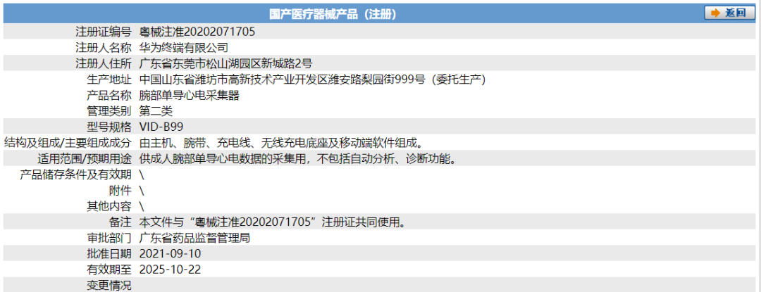 确认,华为开始大规模生产医疗器械 10月8日,广东省食药监局发布了广东省医疗器械注册人制度试点批准产品名单(截至2021-10-8),华为腕部单导心电采集器正式批准生产,注册证号为:粤械注准20202071705,受托人为歌尔股份有限公司以及潍坊京为高科电子科技有限公司。 也就是说,华为开始大规模生产医疗器械了,大家期待么? 不得不说,华为的医疗器械从拿证到生产,速度可见一斑。早在今年5月,华为消费者业务手机产品线总裁“何刚”就微博发文指出,华为首款可以测量血压的智能手表已通过医疗器械注册检验,下一步将联合专业医疗机构开启注册临床试验,预计在今年下半年正式上市。 果不其然,短短数月华为首款医疗设备正式进入生产阶段,并且就在上个月6日,华为还通过其会员App开启血压测试受试者招募,要求腕围大于200毫米,且血压高于140mm Hg者优先。 据国家药监局国产医疗器械产品资料中显示,其产品名称具体为腕部单导心电采集器,第二类医疗设备,批准日期为2021年9月10日,有效期至2025年10月22日。 华为4款医械产品,进入优先审批! 近期,据广东省食药监局了解,除腕部单导心电采集器外,华为还有三款医疗器械进入优先审批程序。 分别是腕部心电血压记录仪(MLY-B10、MLY-B11)、心电分析系统(ECG-1)、心率失常分析系统(PPG-1)。 根据目前的产品布局,有相关人士分析,华为可能将单独拆分一条产品线,做一款主打血压测量的智能手表,当然也有可能将功能同步到其他华为智能手表上。 早在2020年9月,华为还公开了一种机器人及心电检测方法,以解决现有采用便携式心电记录仪心电检测时操作不便的问题,以帮助高血压患者第一时间获悉自己的血压状态,并及早干预治疗。 所以显然,目前华为正以家用医疗级高精度血压测量为核心,研发可穿戴血压测量设备,同时华为与国内知名机构启动高血压管理研究,探索从筛查到早期干预的血压创新主动健康管理。 而这,仅仅只是华为在医疗领域的布局之一。据华为官方显示,华为医疗目前已经服务超过3000家医疗卫生服务机构。为医疗行业提供全面覆盖,安全可控,运维简单,面向未来的无线网络解决方案。 据悉,在郑大附一院的建设中,第一台远程5G动物手术以及人体手术就是由华为分别和联通、移动合作完成的。 在信息化建设上,华为还曾服务过一大批三甲医院,比如华西医院、同仁医院、中国人民解放军总医院、南京鼓楼等。 巨头扎堆,百亿级市场争一杯羹 在华为努力深耕的医疗健康穿戴领域,还有许多高端玩家,但是目前国内获得医疗器械二类证的四款ECG功能智能手表的仅有华为、苹果、华米、OPPO。 早在2018年,苹果ECG APP和心率不齐提醒功能就获得了FDA审批,布局医疗健康穿戴领域,今年6月21日正式获得我国药监局医疗器械注册证。9月15日,苹果公司另外一款移动脉率房颤提示软件,同样获得医疗器械注册证,编号为国械注进20212210317。 今年7月,华米发布了PumpBeats血压监测引擎;去年9月,OPPO取得NMPA医疗器械二类证,国内首款获证智能手表诞生。 各大厂商纷纷为智能手表添加黑科技,往结果更准确的医疗器械方向进军。通过智能穿戴设备,人们可以更好的管控自己的生活状态,营造数字化健康生活,特别是老年人,通过专业医疗级智能可穿戴设备可以更好的监测、管理健康。 据第七次全国人口普查数据显示,我国60岁及以上人口占全国人口的比重为18.7%,65岁及以上人口的比重为13.5%,分别比第六次全国人口普查结果上升了5.44和4.63个百分点。 显然,中国已经处于老龄化社会,庞大的老年人的医疗需求量急剧增加,给专业医疗级智能可穿戴设备市场带来了机会。预计到2025年中国专业医疗级智能可穿戴设备行业市场规模将达到336亿元,2021-2025年复合增长率为20.01%。 百亿级巨大的市场空间,以及国家强有力的政策支持,给各大国产企业提供了肥沃的成长土壤,但是最终谁能在这一领域拔得头筹?让我们拭目以待! |